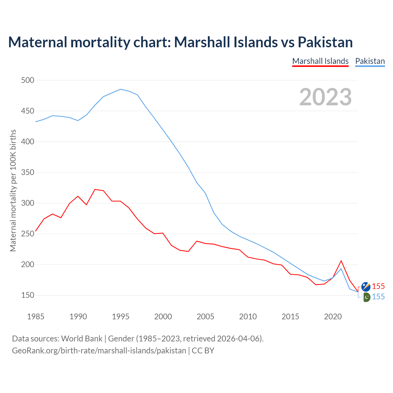 The maternal mortality rate, which is the probability of dying during childbirth or within 42 days of pregnancy termination, is 155 deaths per 100,000 live births in the Marshall Islands, compared to 155 deaths in Pakistan.