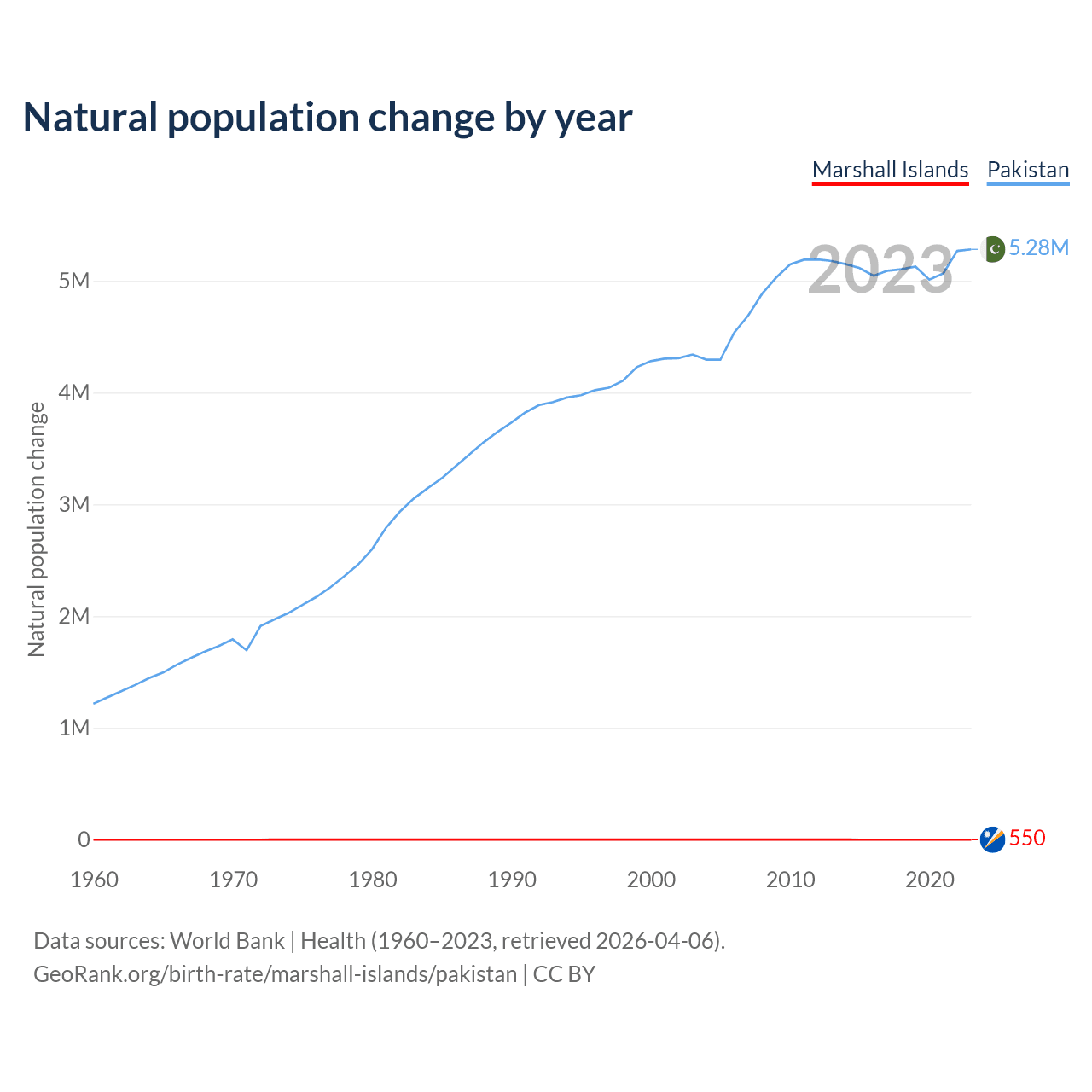 The Marshall Islands has an annual birth rate of 21.1 births per 1,000 people, compared to 27.8 for Pakistan. The average number of children a woman is expected to have during her lifetime — the fertility rate, is 2.92 in the Marshall Islands and 3.61 in Pakistan — 23.5% difference.