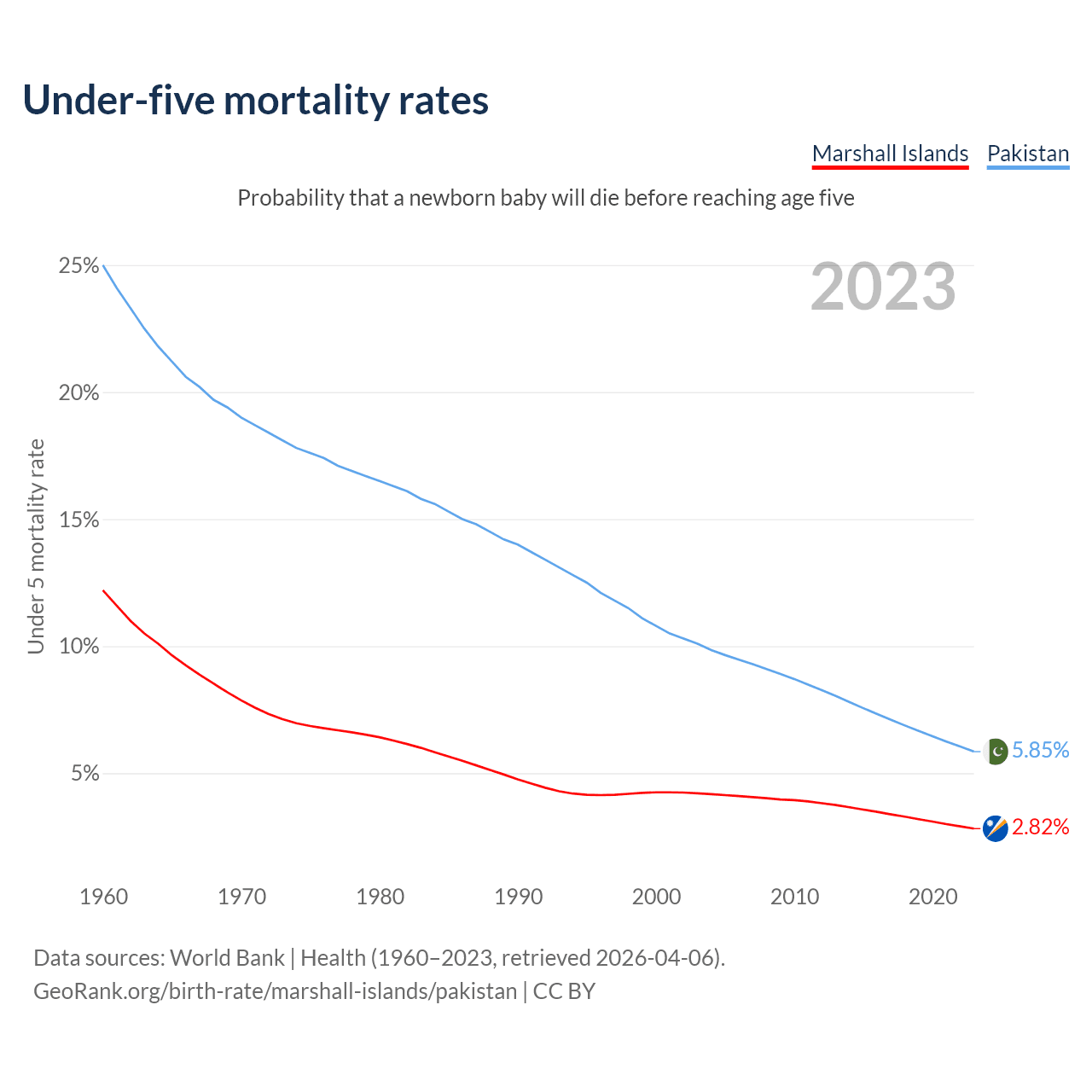 The chance that a newborn baby will die before reaching age five is 2.82% in the Marshall Islands and 5.85% in Pakistan. Above is a chart with historical data on under-five mortality rates.