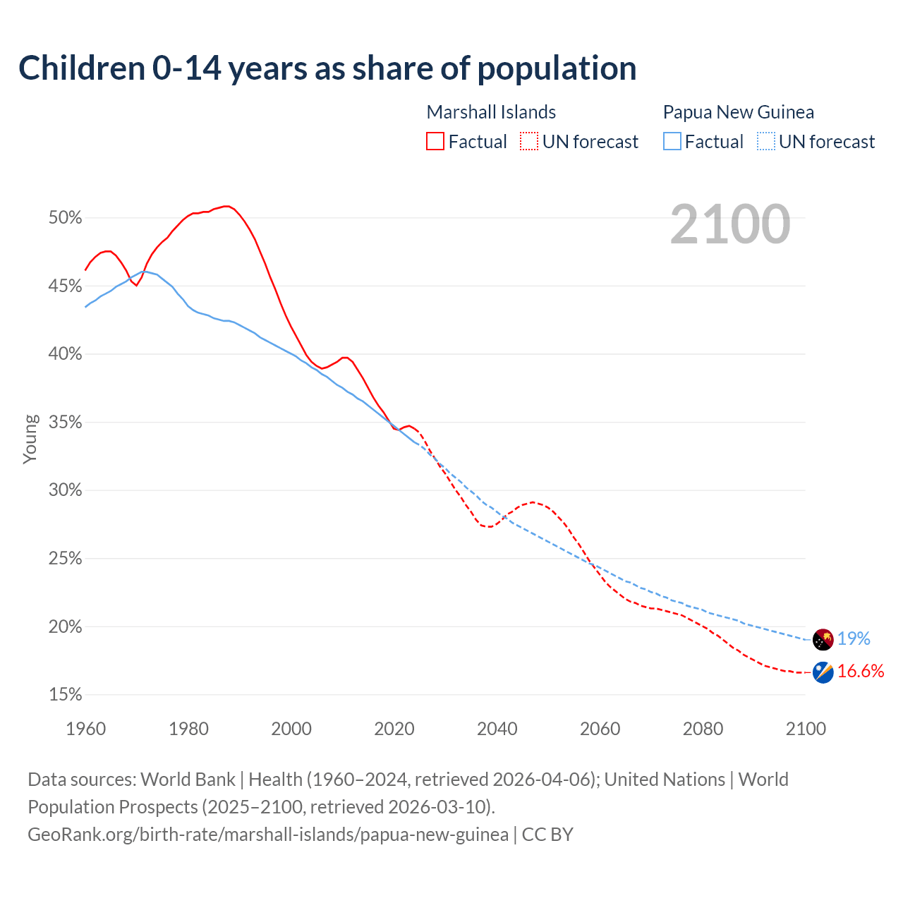 According to the latest available data on birth rates, the fertility rate in the Marshall Islands was 2.92 children per woman in 2023, compared to 3.1 in Papua New Guinea in 2023. The replacement level is considered to be 2.1 children per woman.