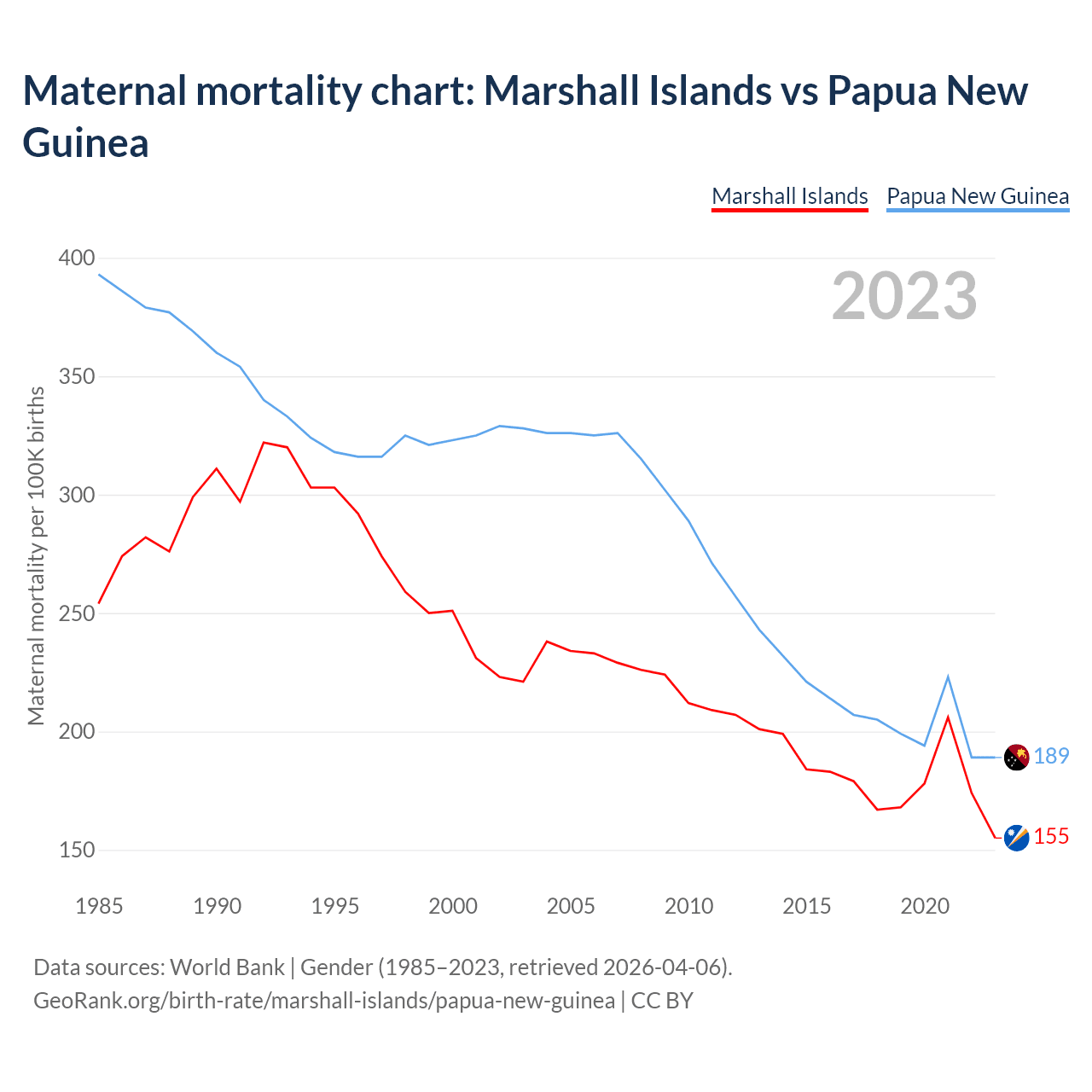 The maternal mortality rate, which is the probability of dying during childbirth or within 42 days of pregnancy termination, is 155 deaths per 100,000 live births in the Marshall Islands, compared to 189 deaths in Papua New Guinea.