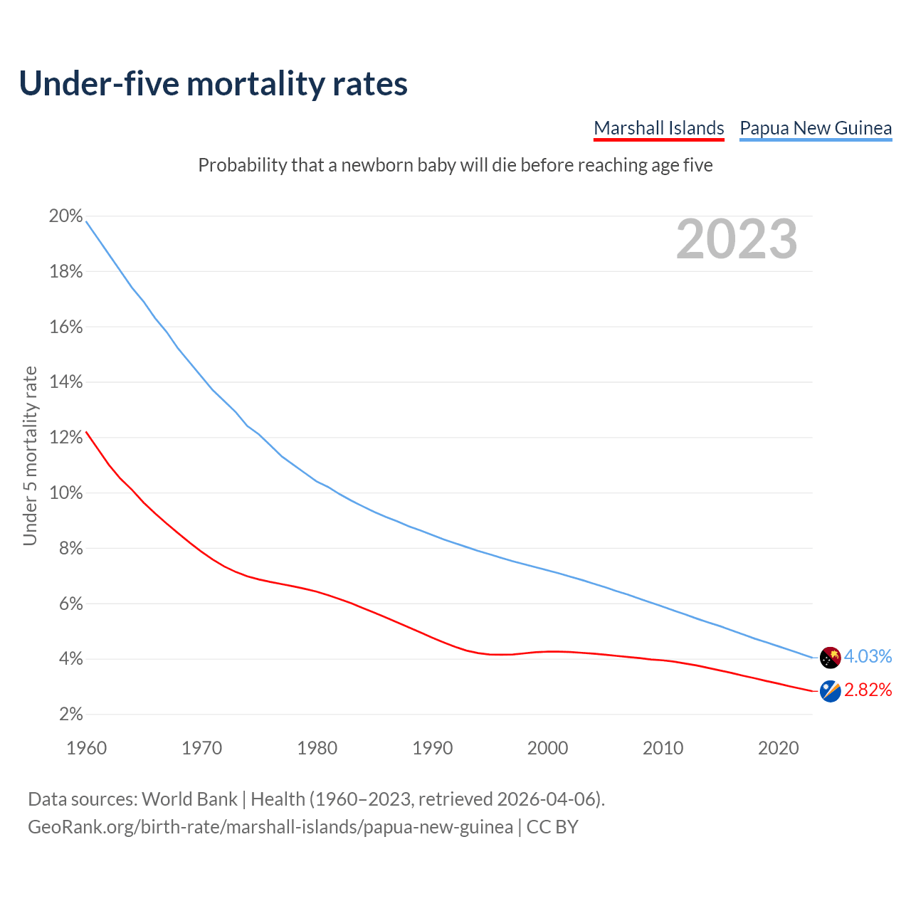 The chance that a newborn baby will die before reaching age five is 2.82% in the Marshall Islands and 4.03% in Papua New Guinea. Above is a chart with historical data on under-five mortality rates.