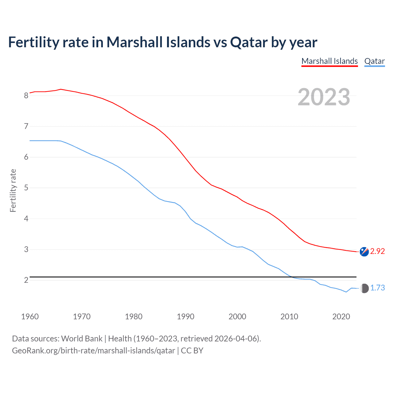 The Marshall Islands has an annual birth rate of 21.1 births per 1,000 people, compared to 9.91 for Qatar. The average number of children a woman is expected to have during her lifetime — the fertility rate, is 2.92 in the Marshall Islands and 1.73 in Qatar — 40.8% difference.