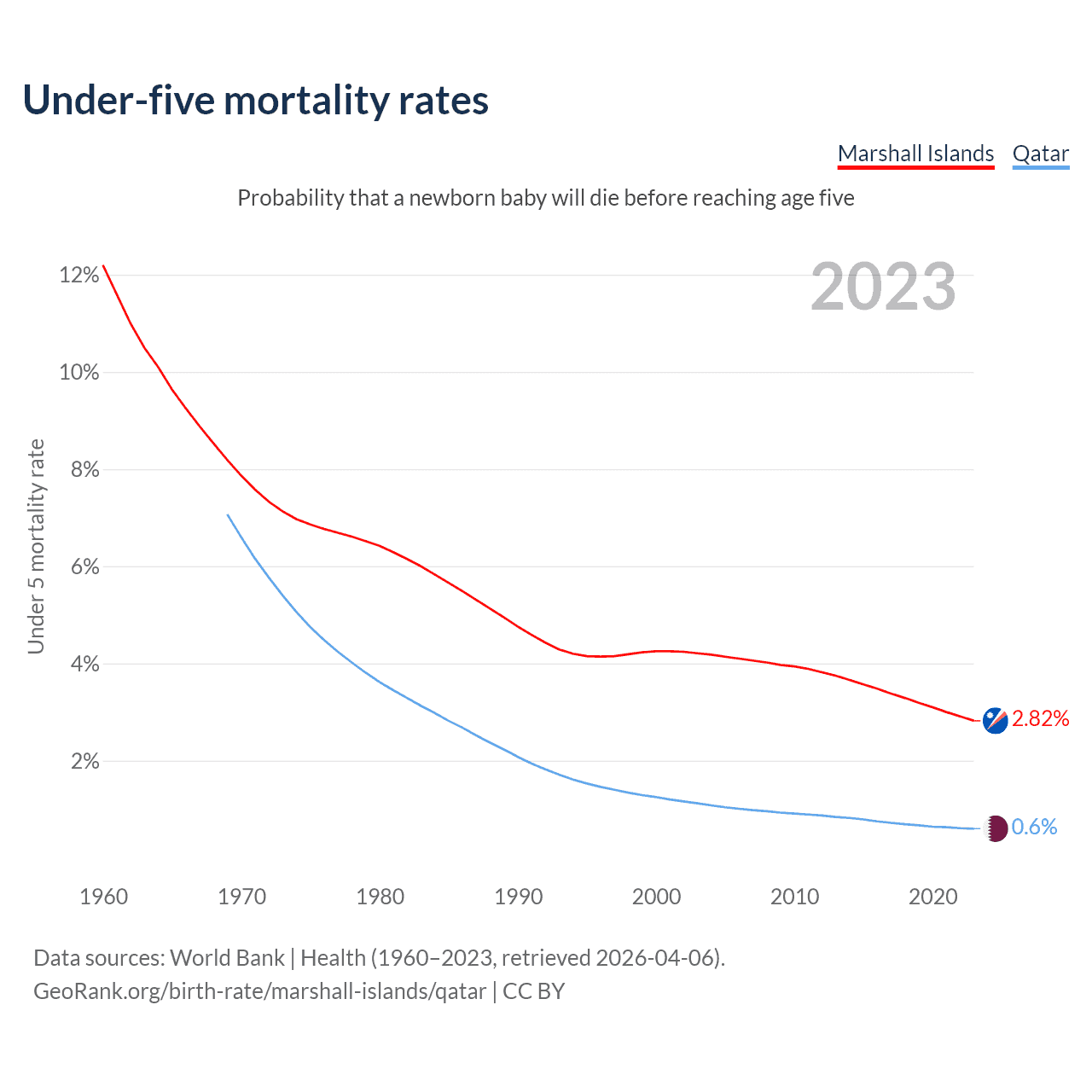 The chance that a newborn baby will die before reaching age five is 2.82% in the Marshall Islands and 0.6% in Qatar. Above is a chart with historical data on under-five mortality rates.