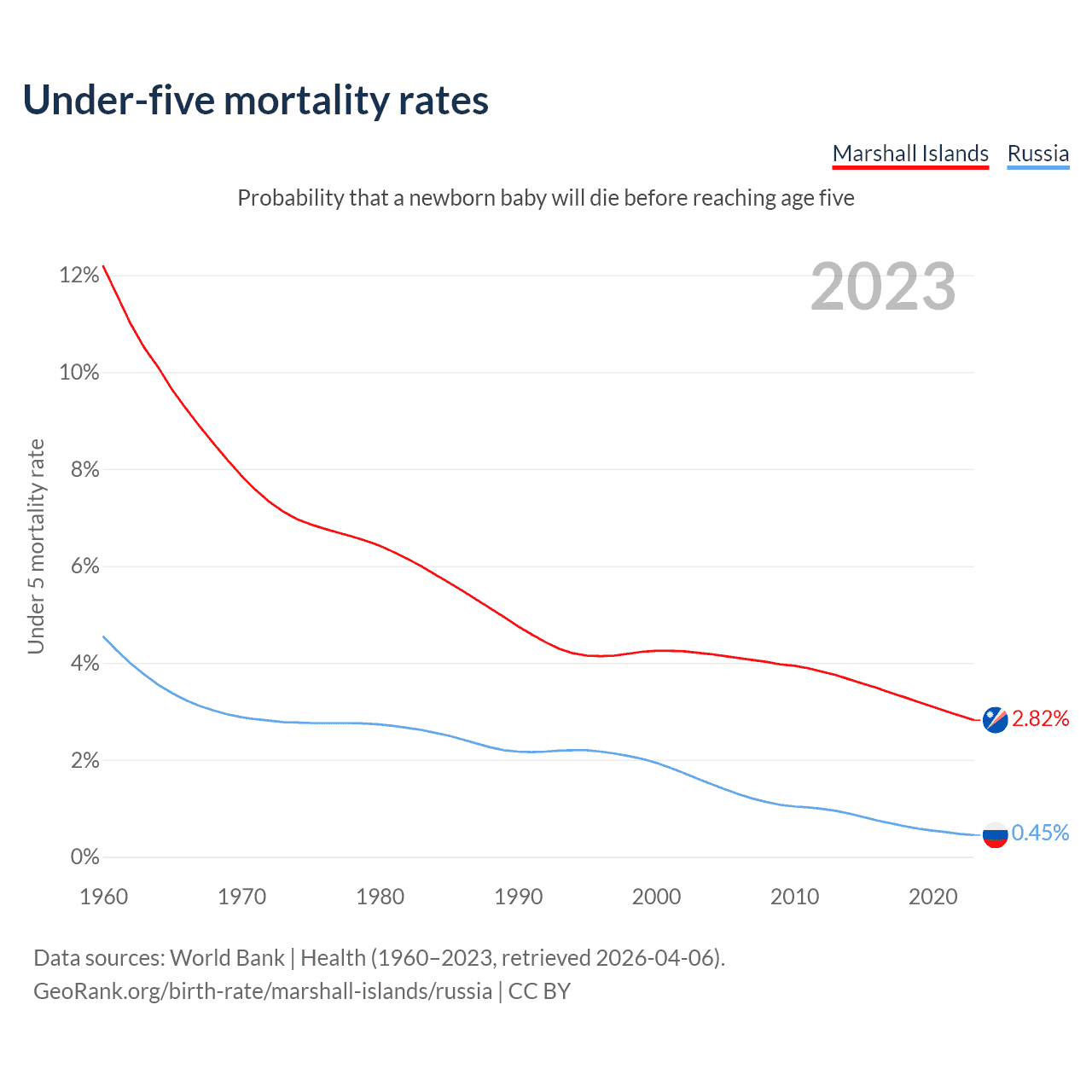 The chance that a newborn baby will die before reaching age five is 2.82% in the Marshall Islands and 0.45% in Russia. Above is a chart with historical data on under-five mortality rates.
