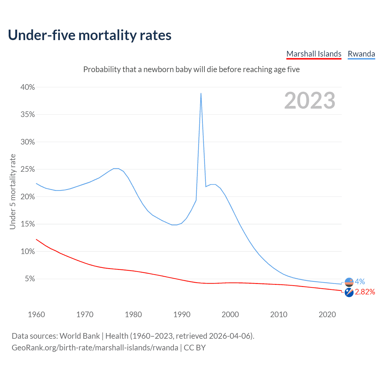 The chance that a newborn baby will die before reaching age five is 2.82% in the Marshall Islands and 4% in Rwanda. Above is a chart with historical data on under-five mortality rates.