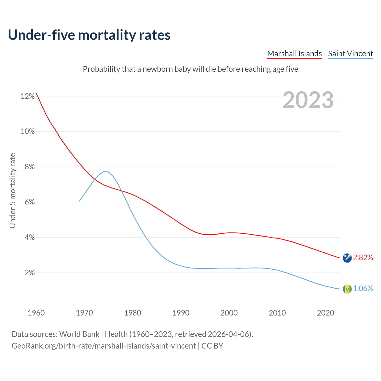 The chance that a newborn baby will die before reaching age five is 2.82% in the Marshall Islands and 1.06% in Saint Vincent. Above is a chart with historical data on under-five mortality rates.