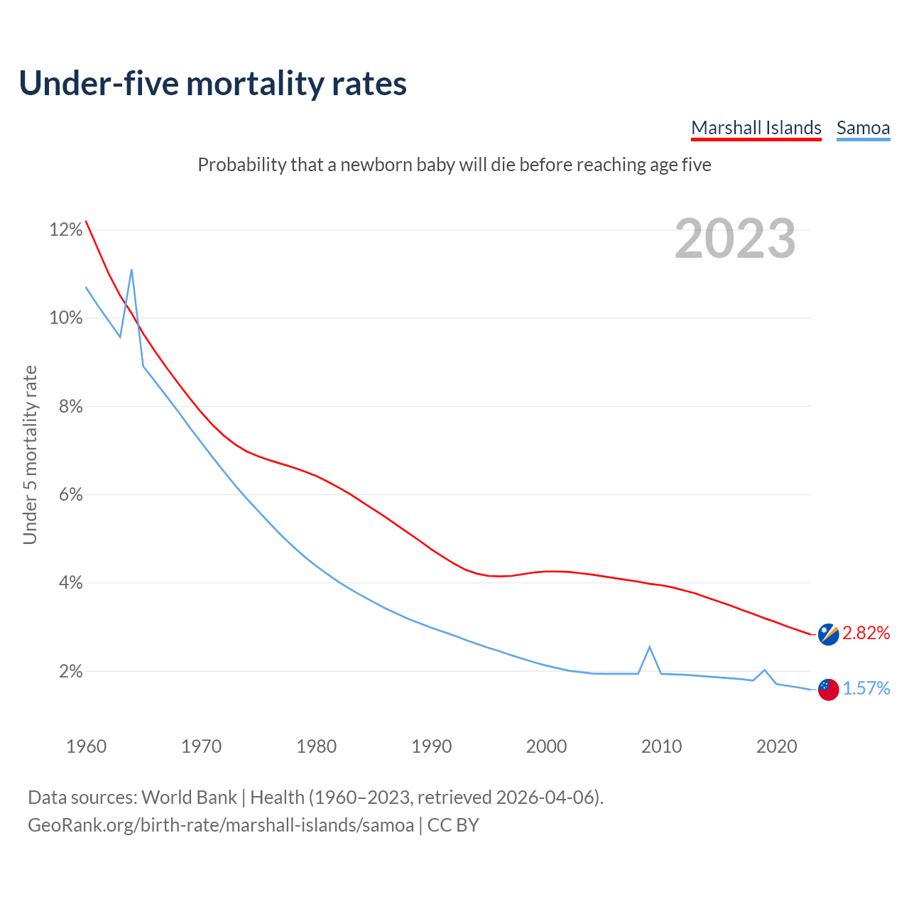 The chance that a newborn baby will die before reaching age five is 2.82% in the Marshall Islands and 1.57% in Samoa. Above is a chart with historical data on under-five mortality rates.
