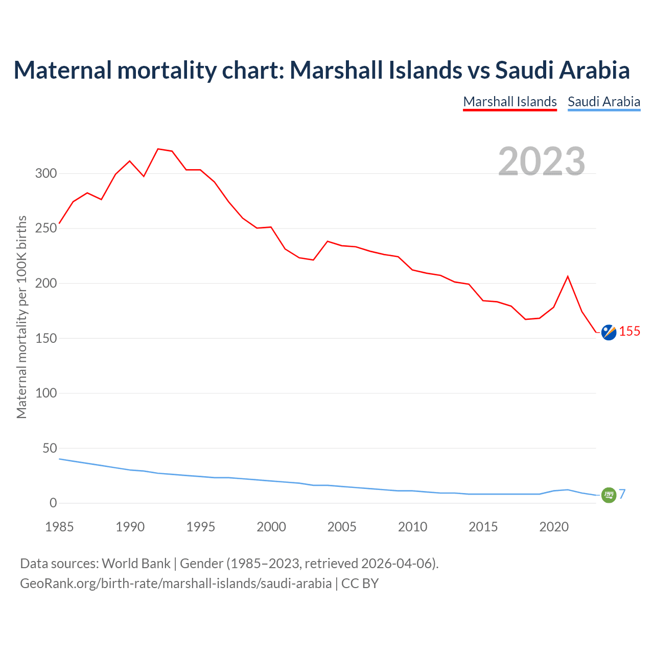 The maternal mortality rate, which is the probability of dying during childbirth or within 42 days of pregnancy termination, is 155 deaths per 100,000 live births in the Marshall Islands, compared to 7 deaths in Saudi Arabia.