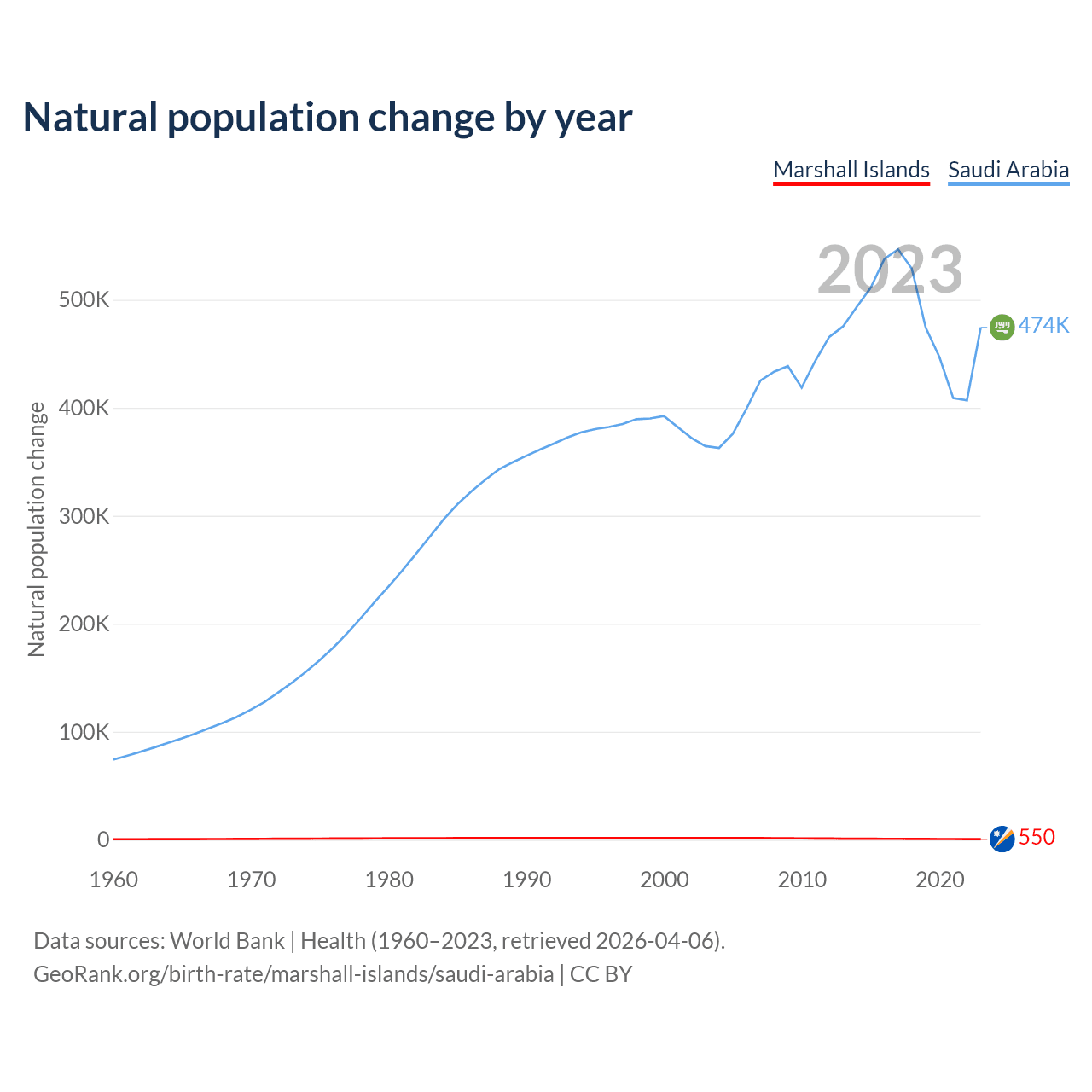 The Marshall Islands has an annual birth rate of 21.1 births per 1,000 people, compared to 16.4 for Saudi Arabia. The average number of children a woman is expected to have during her lifetime — the fertility rate, is 2.92 in the Marshall Islands and 2.28 in Saudi Arabia — 21.9% difference.