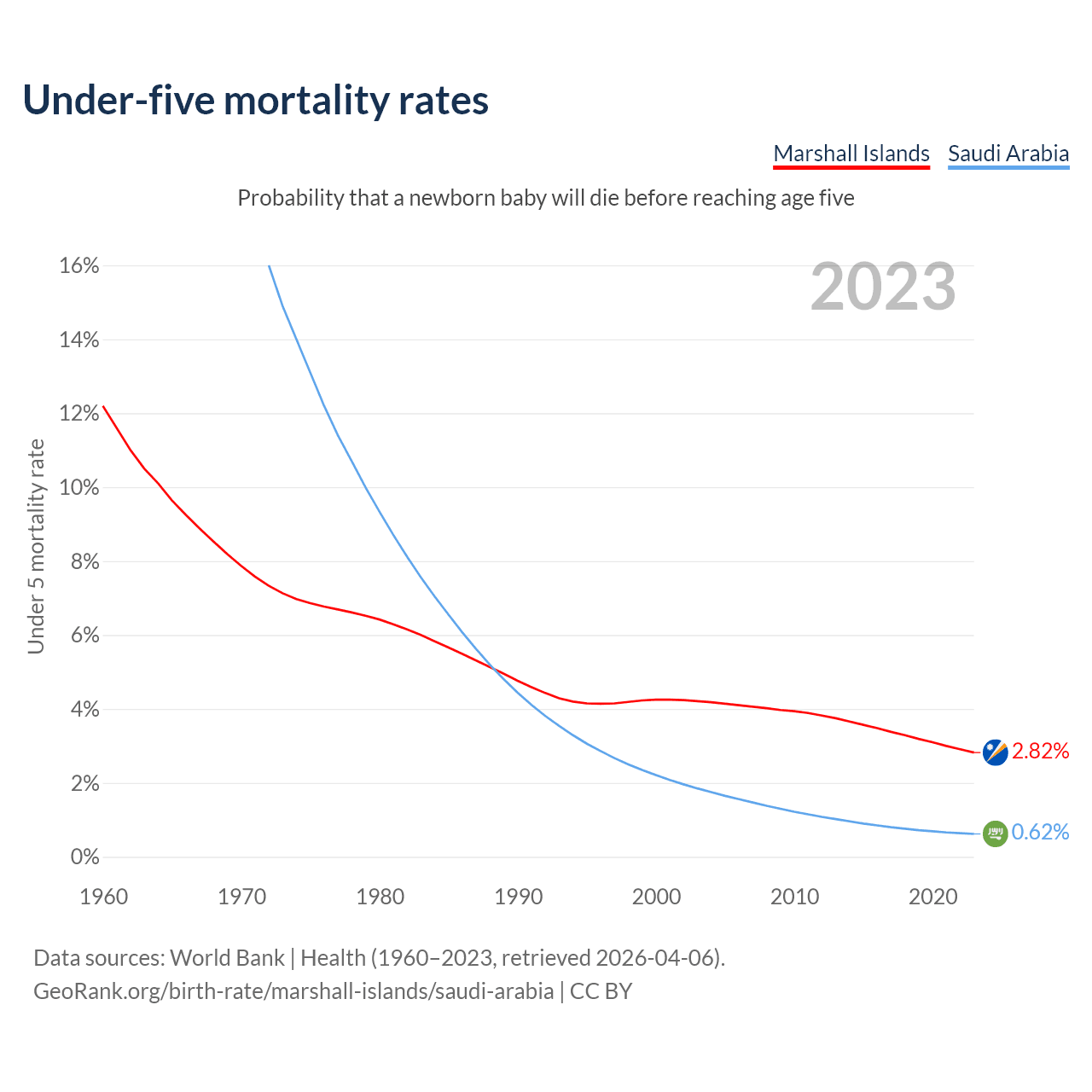 The chance that a newborn baby will die before reaching age five is 2.82% in the Marshall Islands and 0.62% in Saudi Arabia. Above is a chart with historical data on under-five mortality rates.