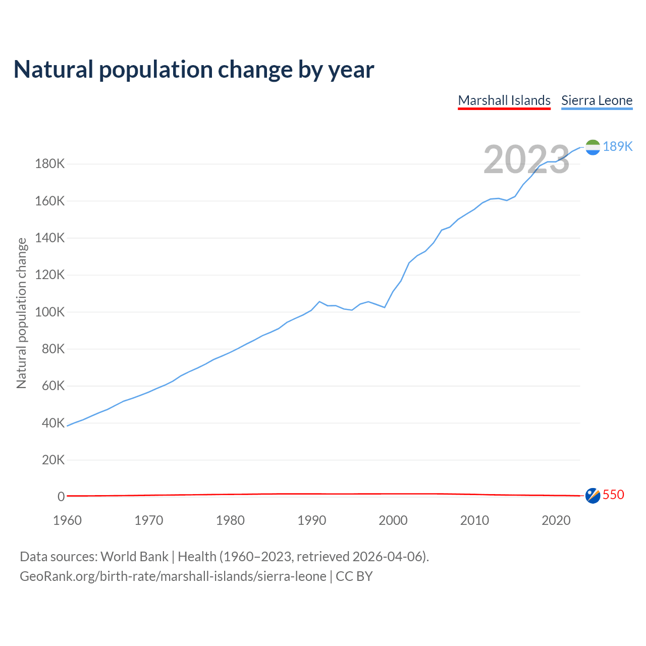 The Marshall Islands has an annual birth rate of 21.1 births per 1,000 people, compared to 30.6 for Sierra Leone. The average number of children a woman is expected to have during her lifetime — the fertility rate, is 2.92 in the Marshall Islands and 3.79 in Sierra Leone — 29.9% difference.