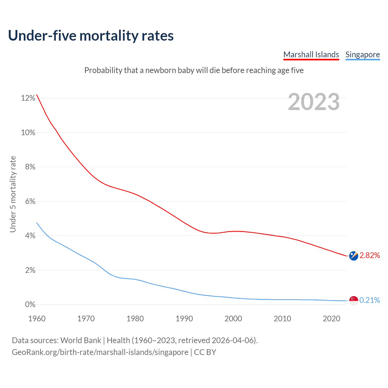 The chance that a newborn baby will die before reaching age five is 2.82% in the Marshall Islands and 0.21% in Singapore. Above is a chart with historical data on under-five mortality rates.