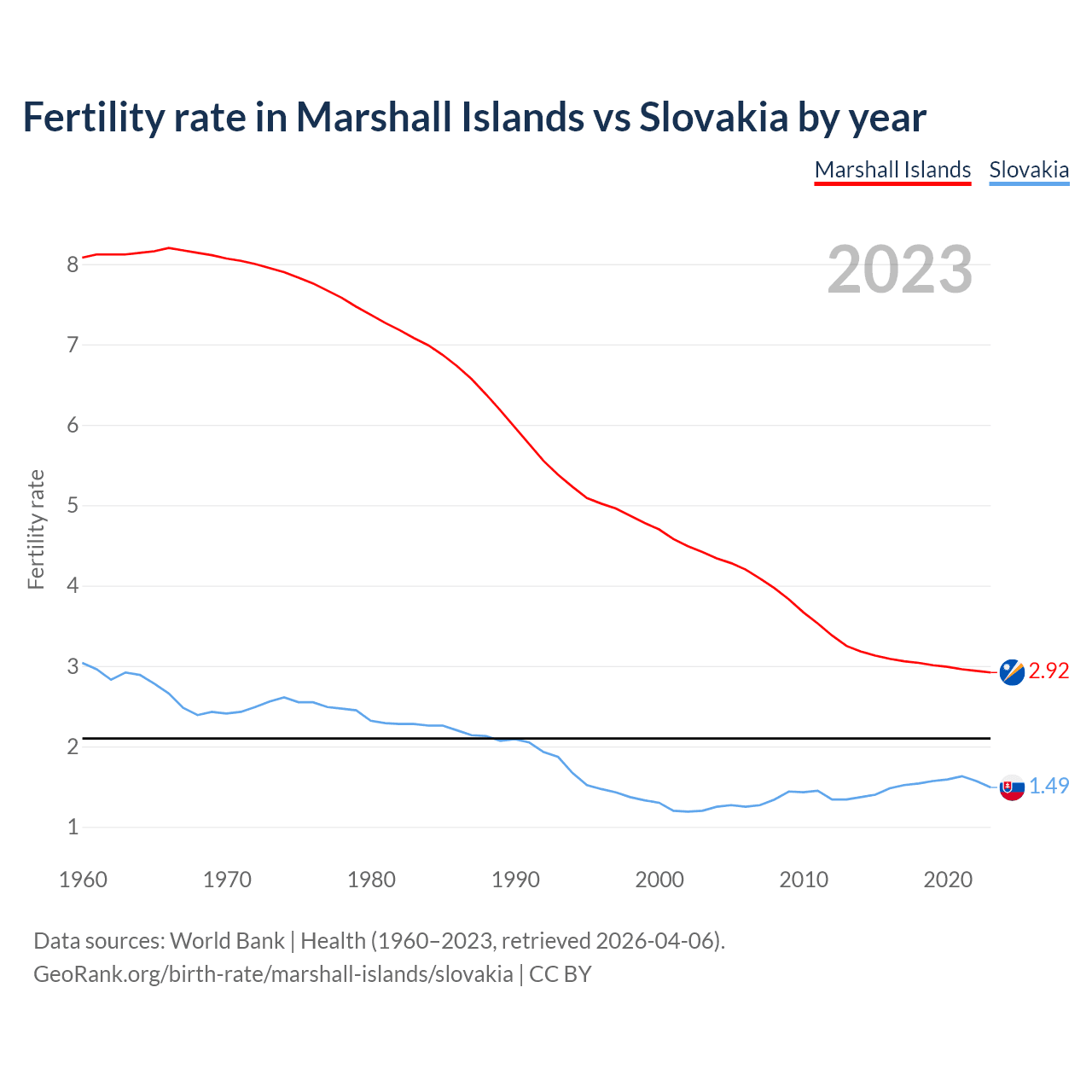 The Marshall Islands has an annual birth rate of 21.1 births per 1,000 people, compared to 9 for Slovakia. The average number of children a woman is expected to have during her lifetime — the fertility rate, is 2.92 in the Marshall Islands and 1.49 in Slovakia — 49% difference.