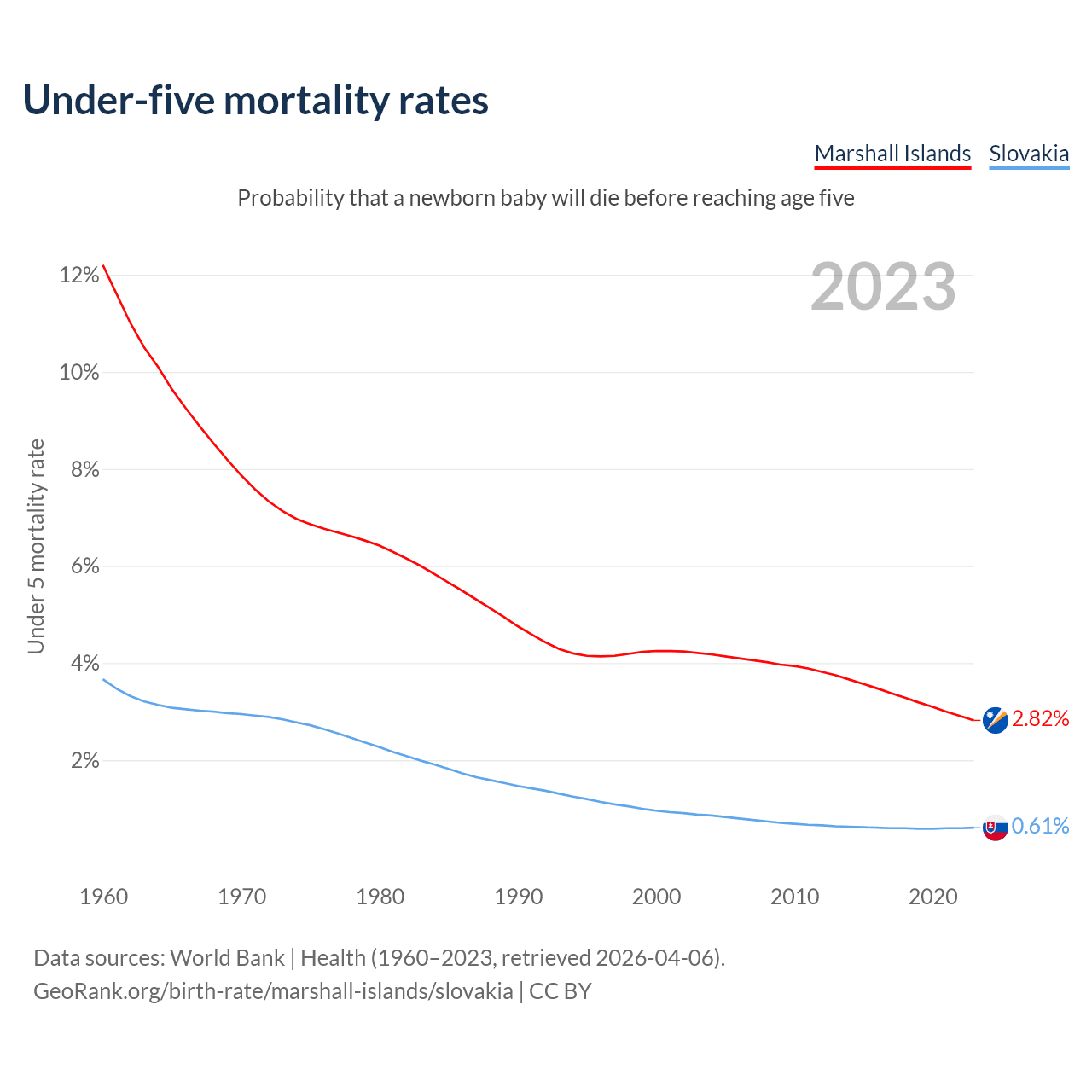 The chance that a newborn baby will die before reaching age five is 2.82% in the Marshall Islands and 0.61% in Slovakia. Above is a chart with historical data on under-five mortality rates.