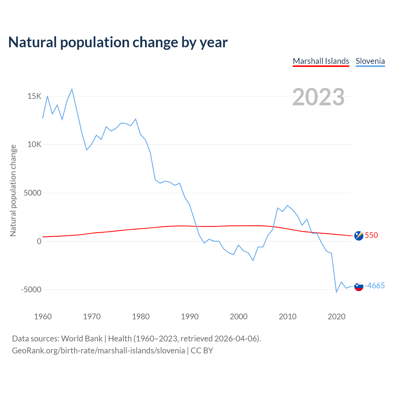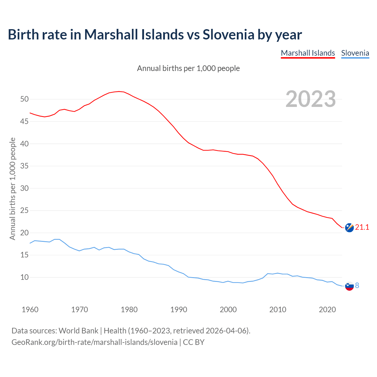 The Marshall Islands has an annual birth rate of 21.1 births per 1,000 people, compared to 8 for Slovenia. The average number of children a woman is expected to have during her lifetime — the fertility rate, is 2.92 in the Marshall Islands and 1.51 in Slovenia — 48.3% difference.