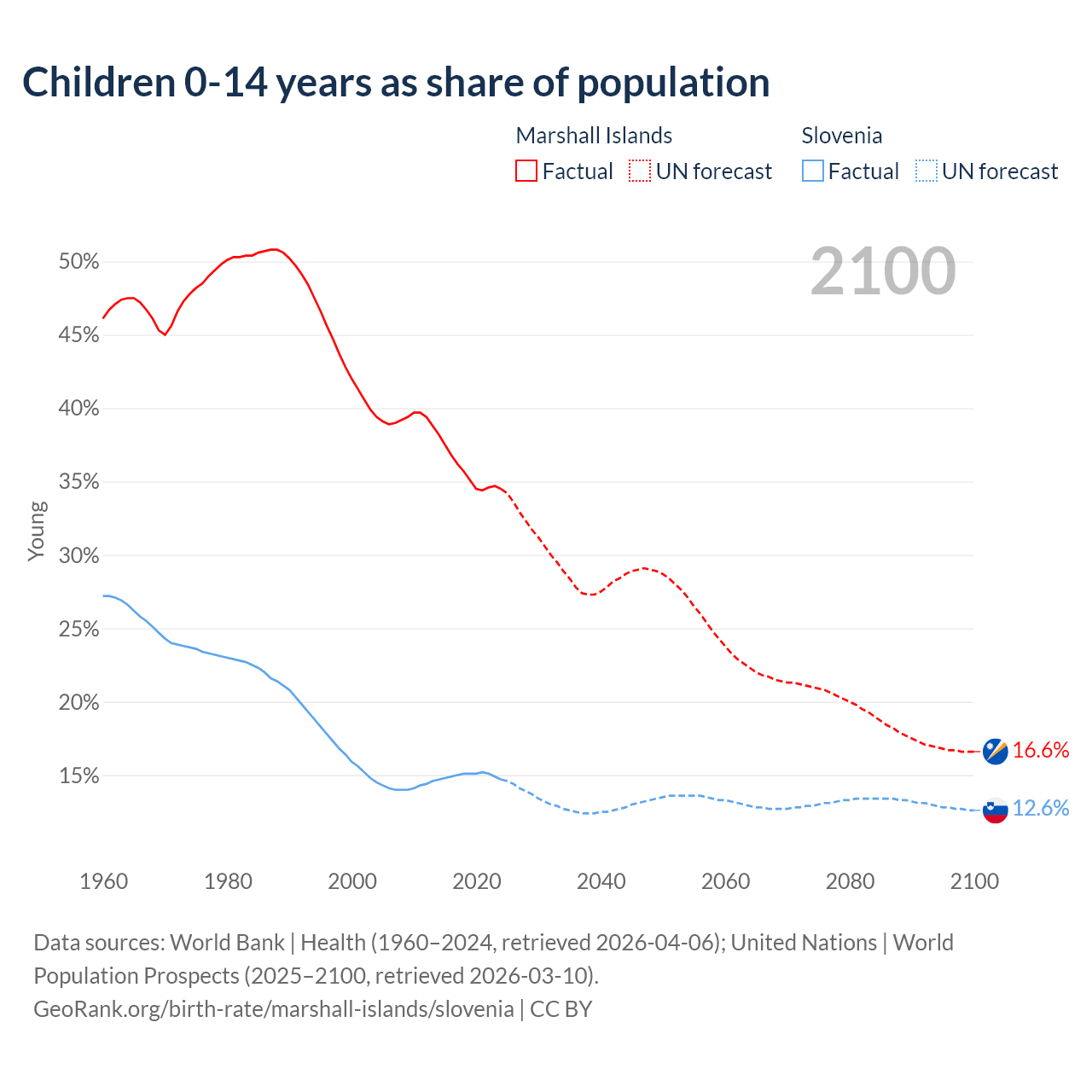 According to the latest available data on birth rates, the fertility rate in the Marshall Islands was 2.92 children per woman in 2023, compared to 1.51 in Slovenia in 2023. The replacement level is considered to be 2.1 children per woman.