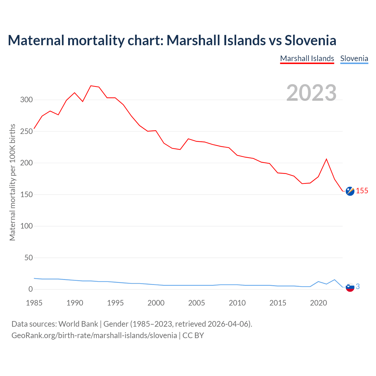 The maternal mortality rate, which is the probability of dying during childbirth or within 42 days of pregnancy termination, is 155 deaths per 100,000 live births in the Marshall Islands, compared to 3 deaths in Slovenia.