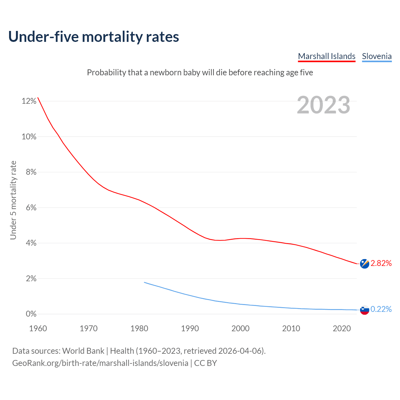The chance that a newborn baby will die before reaching age five is 2.82% in the Marshall Islands and 0.22% in Slovenia. Above is a chart with historical data on under-five mortality rates.