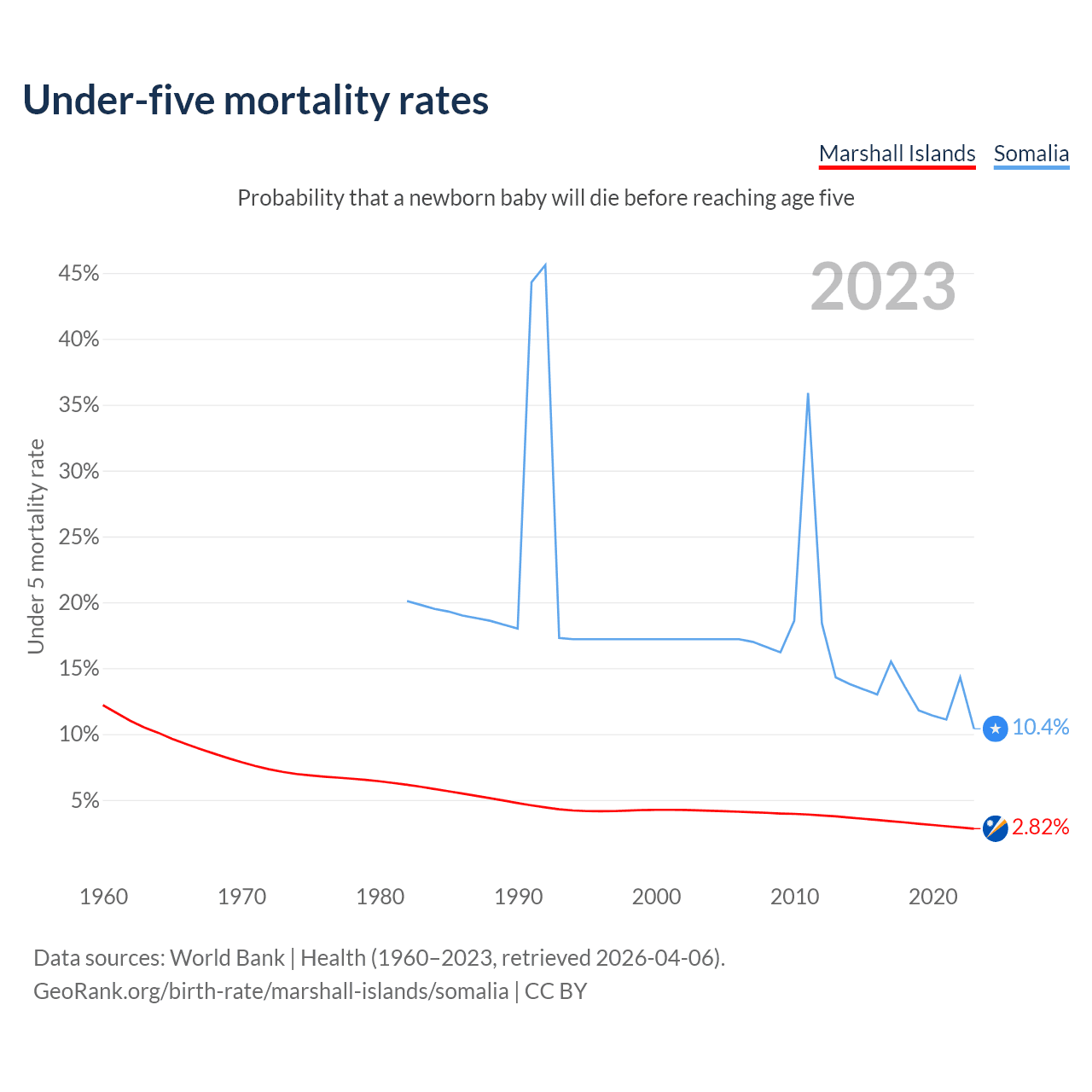 The chance that a newborn baby will die before reaching age five is 2.82% in the Marshall Islands and 10.4% in Somalia. Above is a chart with historical data on under-five mortality rates.
