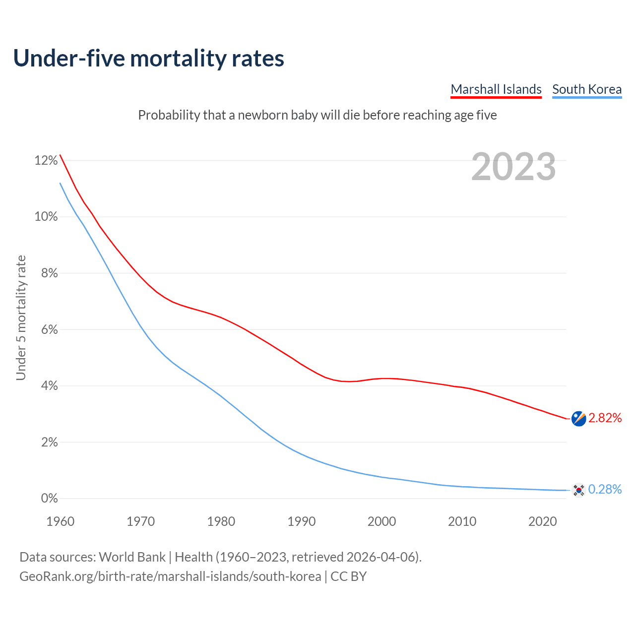 The chance that a newborn baby will die before reaching age five is 2.82% in the Marshall Islands and 0.28% in South Korea. Above is a chart with historical data on under-five mortality rates.