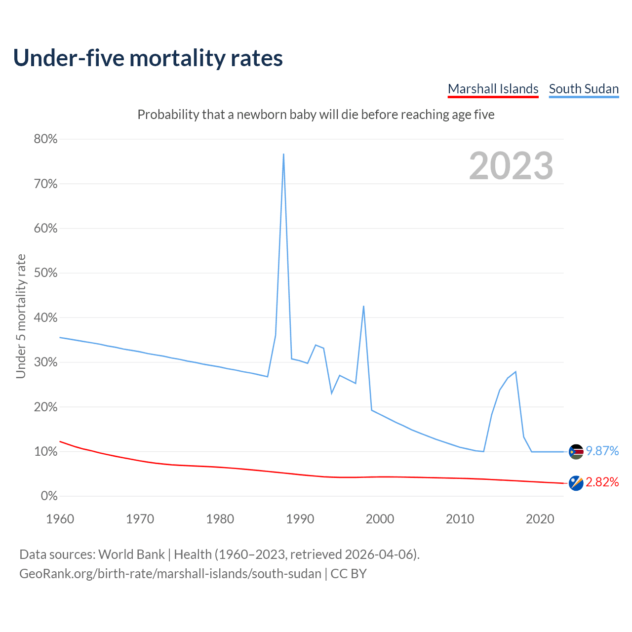The chance that a newborn baby will die before reaching age five is 2.82% in the Marshall Islands and 9.87% in South Sudan. Above is a chart with historical data on under-five mortality rates.