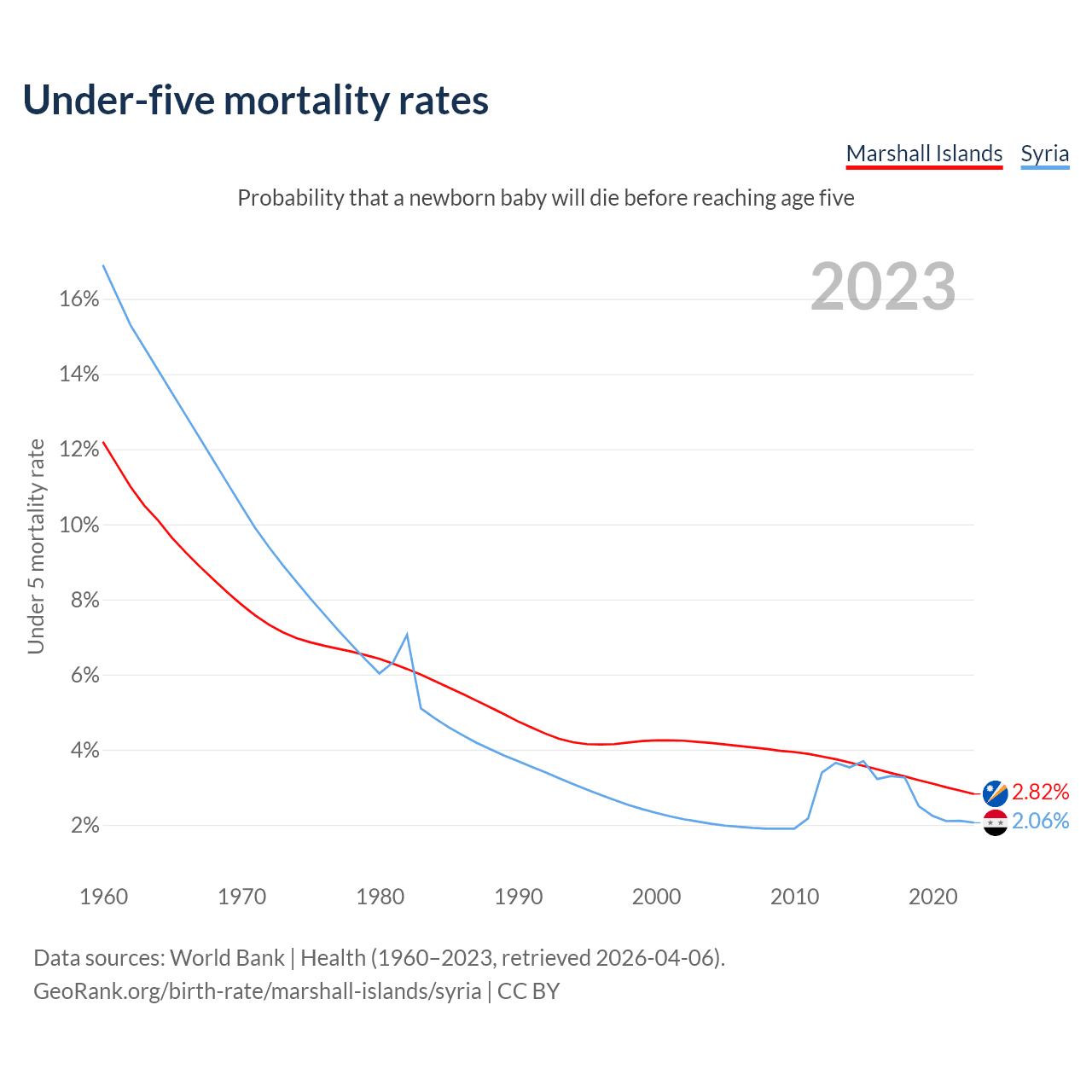 The chance that a newborn baby will die before reaching age five is 2.82% in the Marshall Islands and 2.06% in Syria. Above is a chart with historical data on under-five mortality rates.