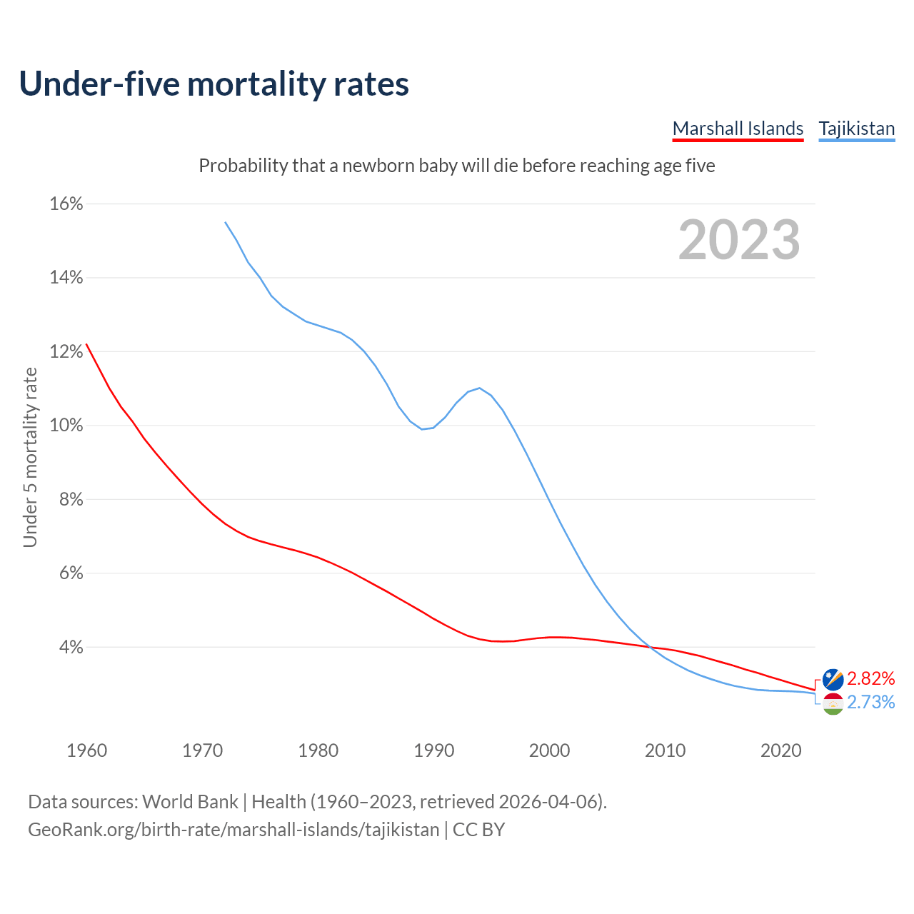 The chance that a newborn baby will die before reaching age five is 2.82% in the Marshall Islands and 2.73% in Tajikistan. Above is a chart with historical data on under-five mortality rates.