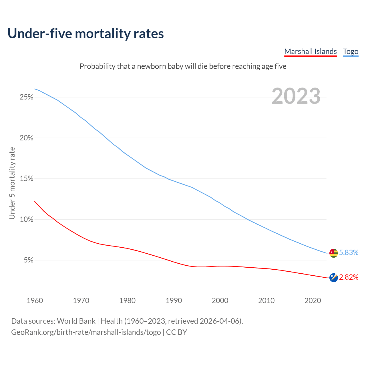 The chance that a newborn baby will die before reaching age five is 2.82% in the Marshall Islands and 5.83% in Togo. Above is a chart with historical data on under-five mortality rates.