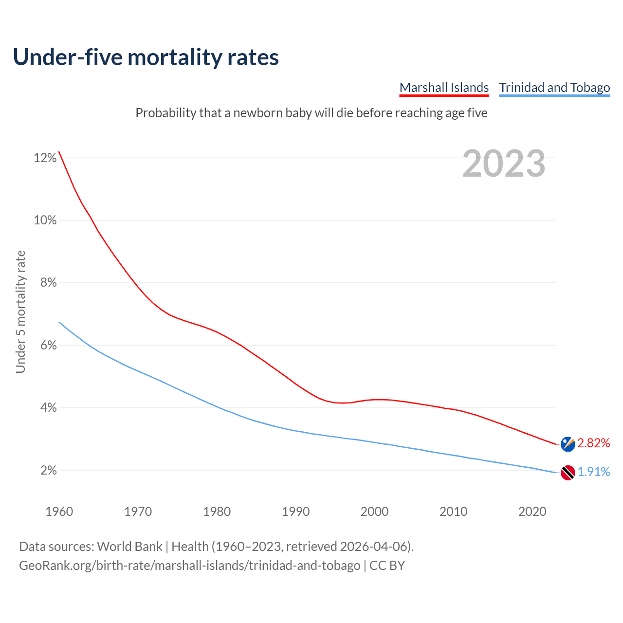 The chance that a newborn baby will die before reaching age five is 2.82% in the Marshall Islands and 1.91% in Trinidad and Tobago. Above is a chart with historical data on under-five mortality rates.
