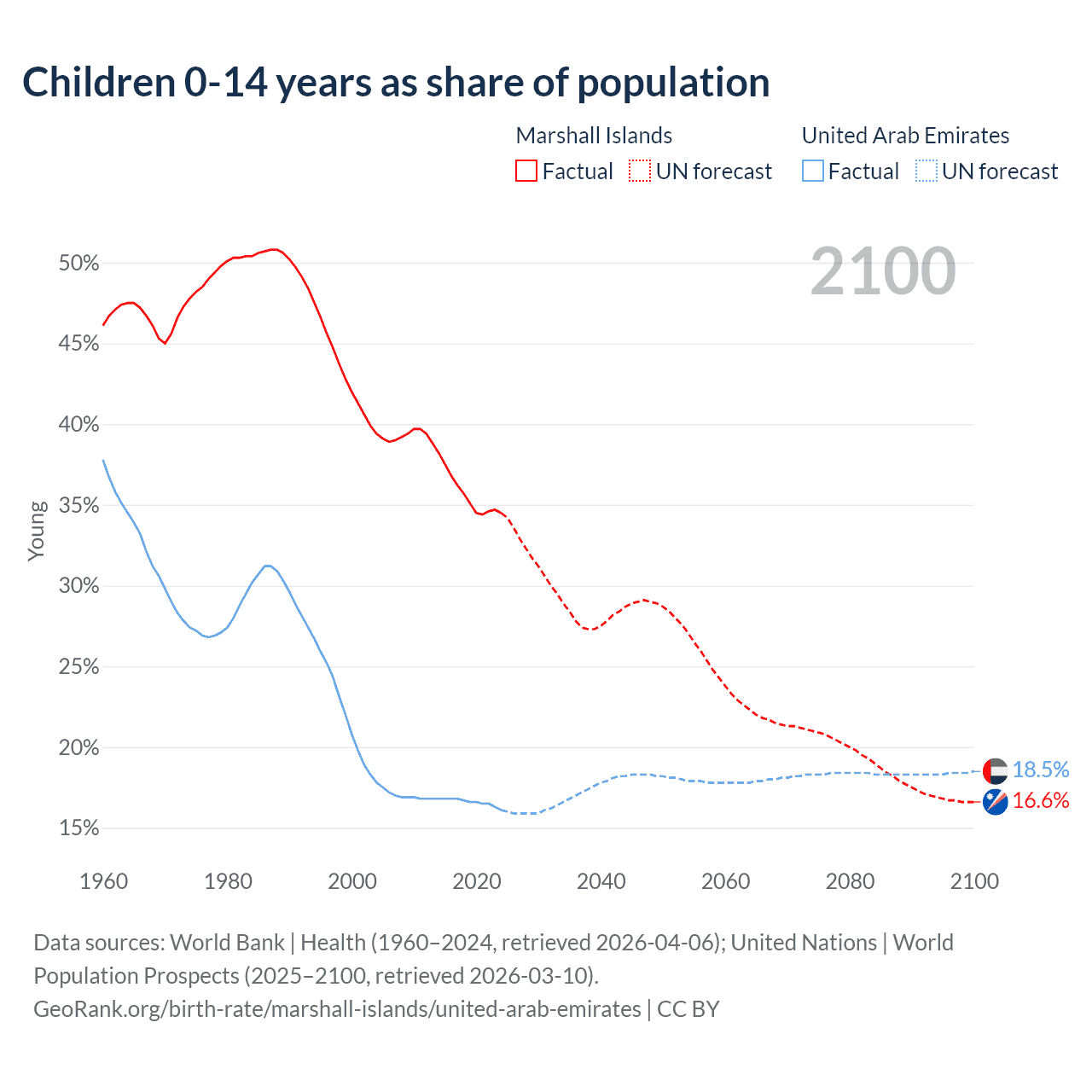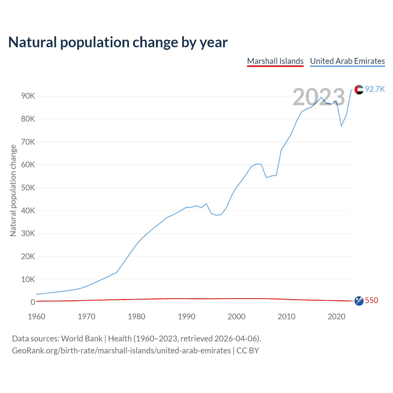 According to the latest available data on birth rates, the fertility rate in the Marshall Islands was 2.92 children per woman in 2023, compared to 1.2 in the United Arab Emirates in 2023. The replacement level is considered to be 2.1 children per woman.