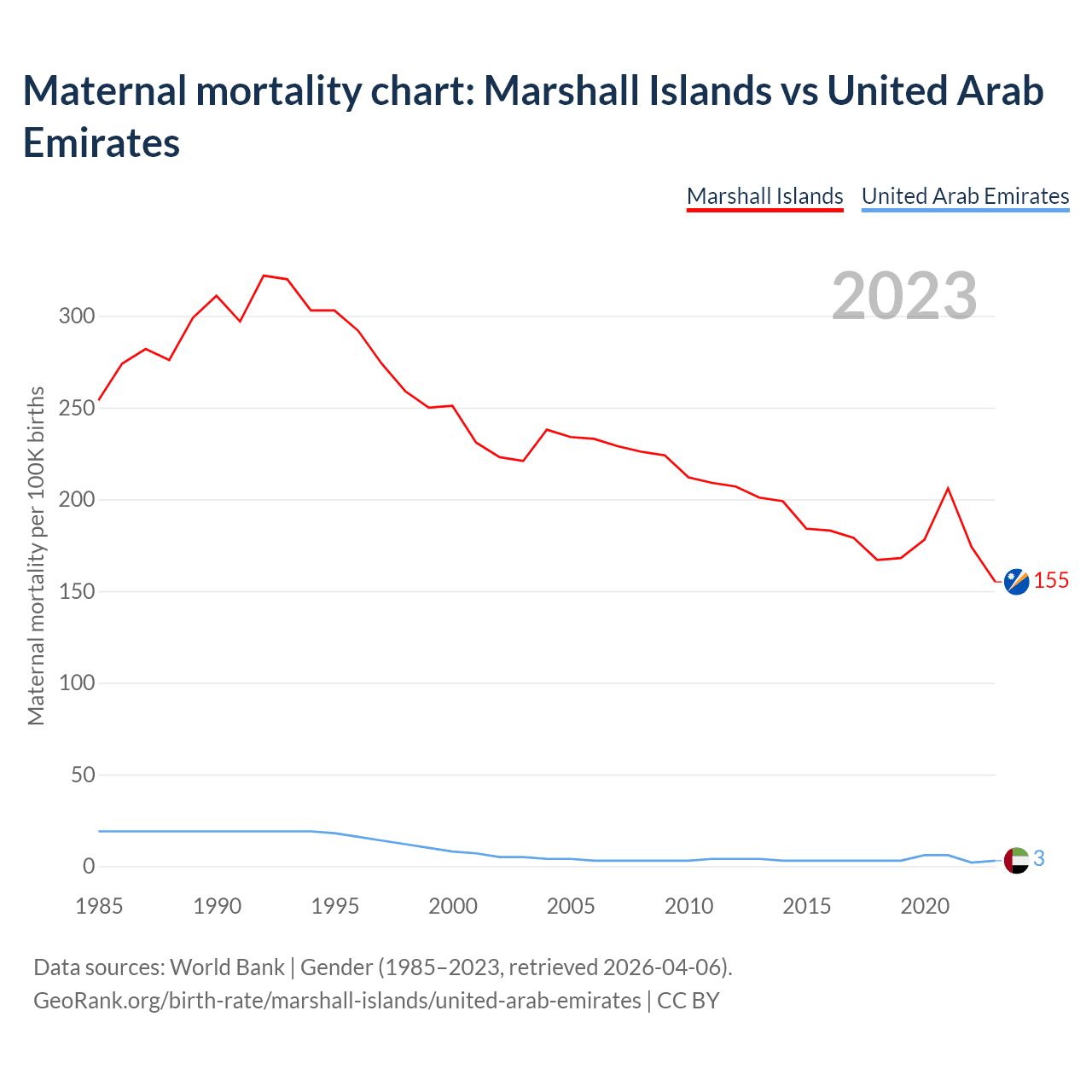 The maternal mortality rate, which is the probability of dying during childbirth or within 42 days of pregnancy termination, is 155 deaths per 100,000 live births in the Marshall Islands, compared to 3 deaths in the United Arab Emirates.