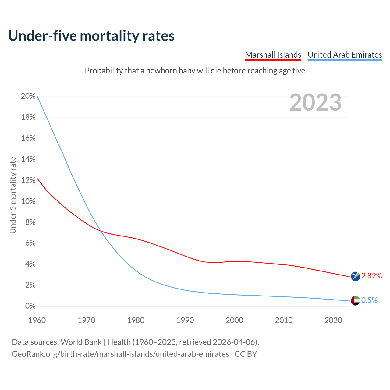 The chance that a newborn baby will die before reaching age five is 2.82% in the Marshall Islands and 0.5% in the United Arab Emirates. Above is a chart with historical data on under-five mortality rates.