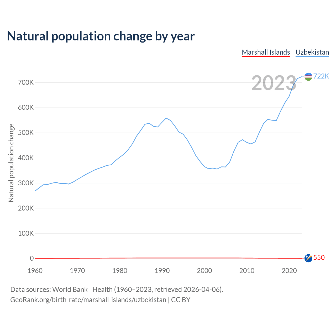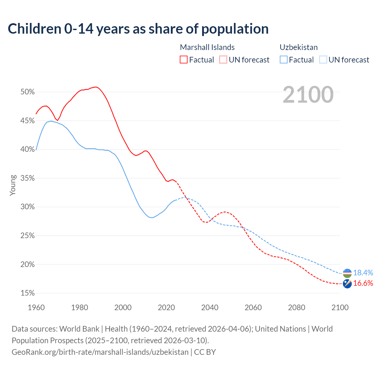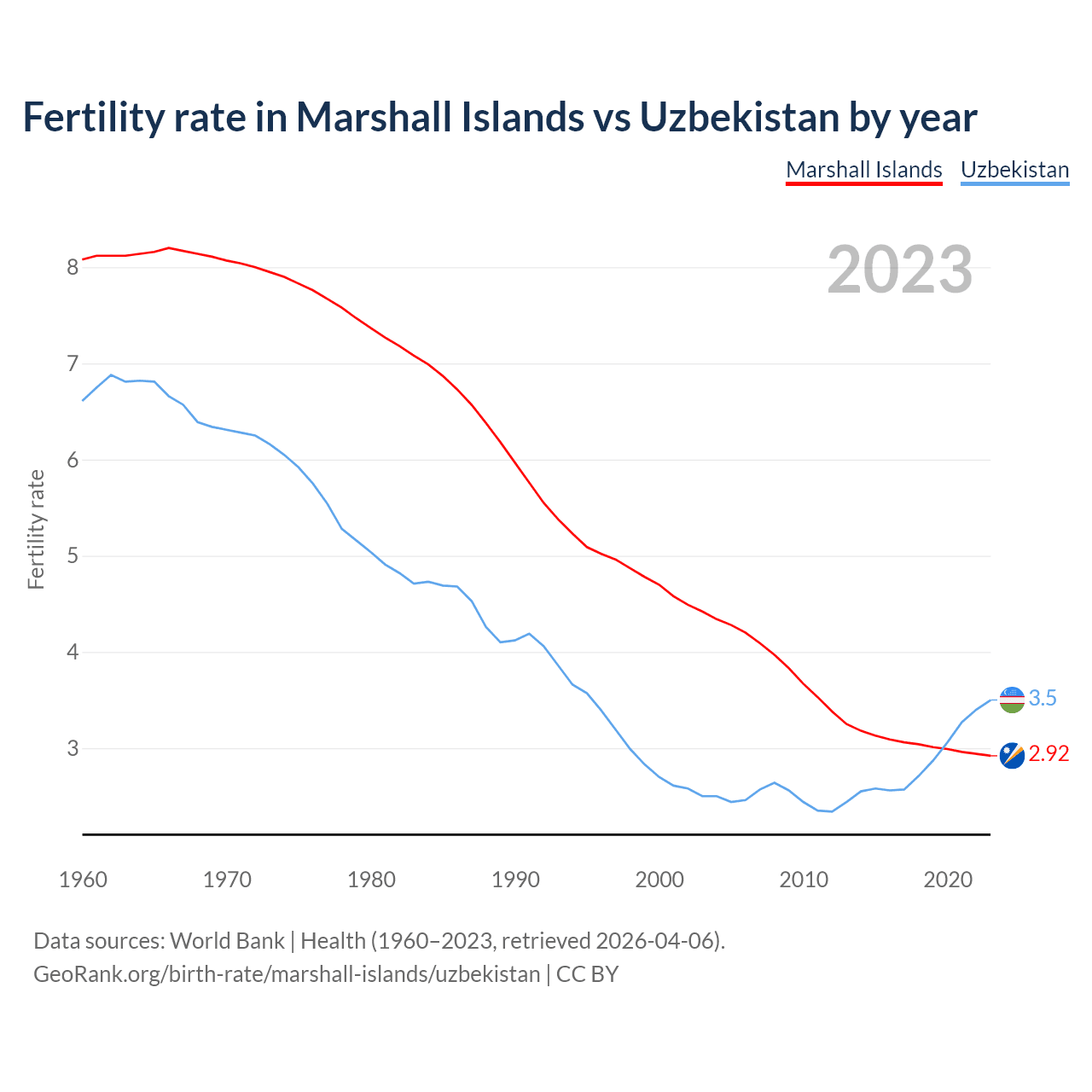 According to the latest available data on birth rates, the fertility rate in the Marshall Islands was 2.92 children per woman in 2023, compared to 3.5 in Uzbekistan in 2023. The replacement level is considered to be 2.1 children per woman.