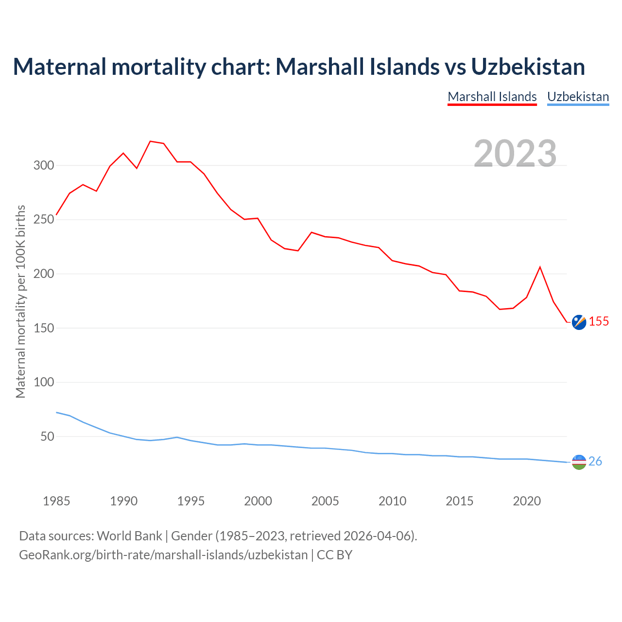 The maternal mortality rate, which is the probability of dying during childbirth or within 42 days of pregnancy termination, is 155 deaths per 100,000 live births in the Marshall Islands, compared to 26 deaths in Uzbekistan.
