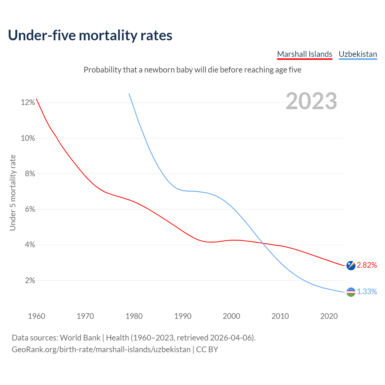 The chance that a newborn baby will die before reaching age five is 2.82% in the Marshall Islands and 1.33% in Uzbekistan. Above is a chart with historical data on under-five mortality rates.