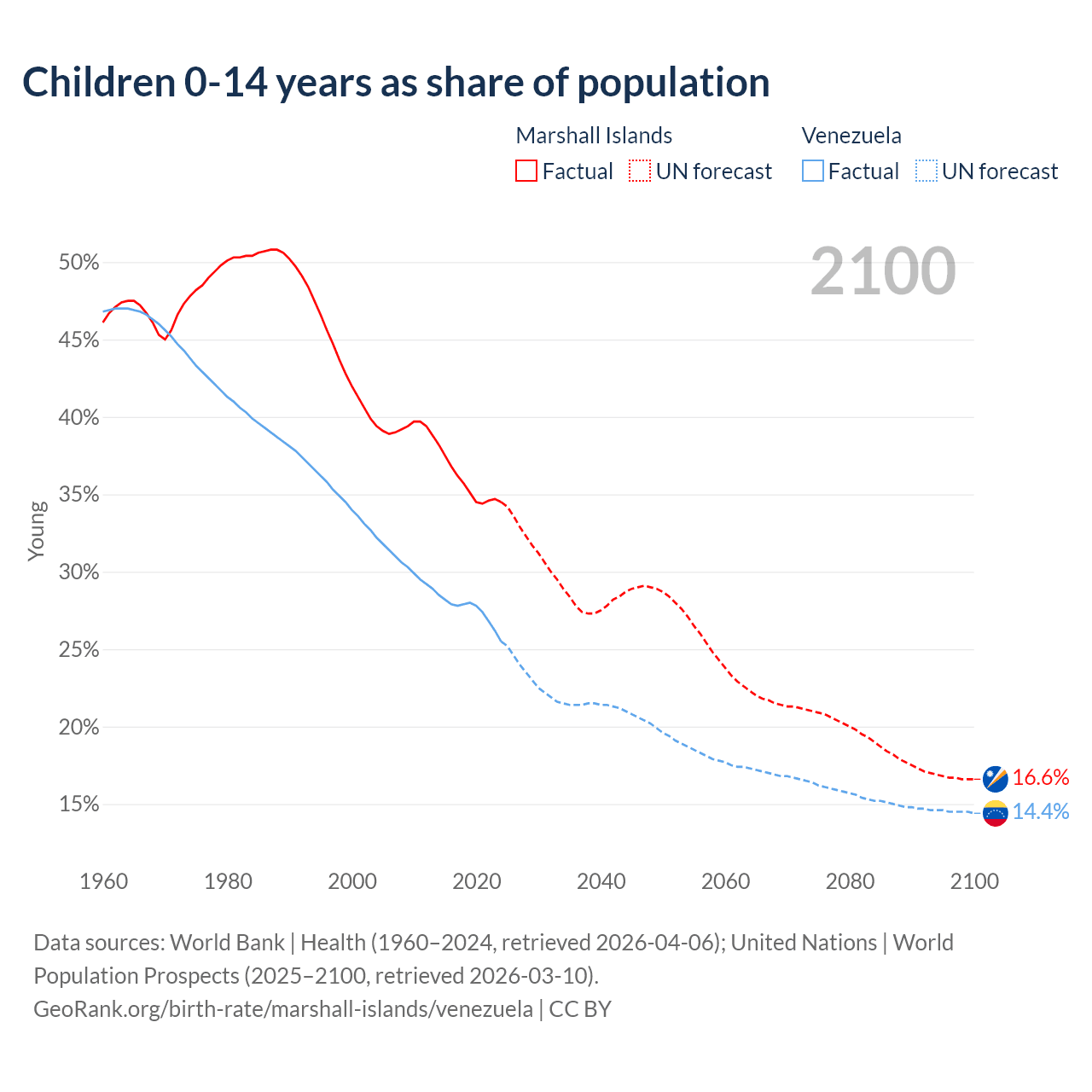 According to the latest available data on birth rates, the fertility rate in the Marshall Islands was 2.92 children per woman in 2023, compared to 2.08 in Venezuela in 2023. The replacement level is considered to be 2.1 children per woman.