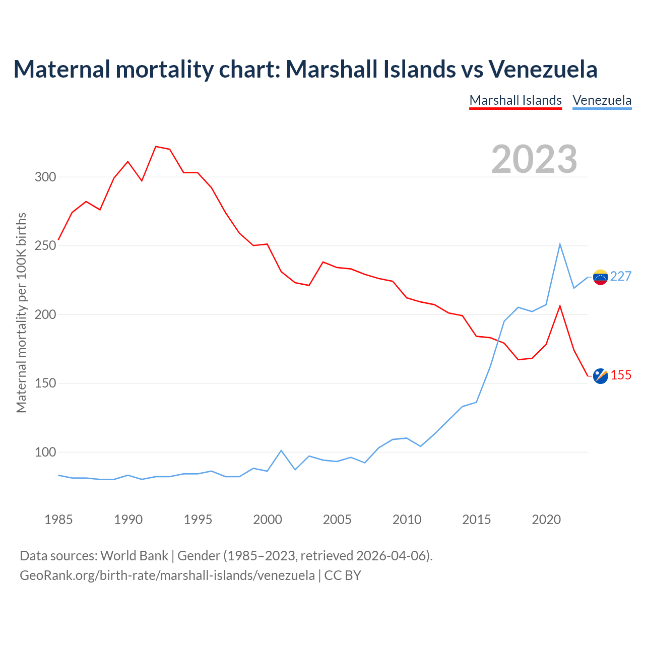 The maternal mortality rate, which is the probability of dying during childbirth or within 42 days of pregnancy termination, is 155 deaths per 100,000 live births in the Marshall Islands, compared to 227 deaths in Venezuela.