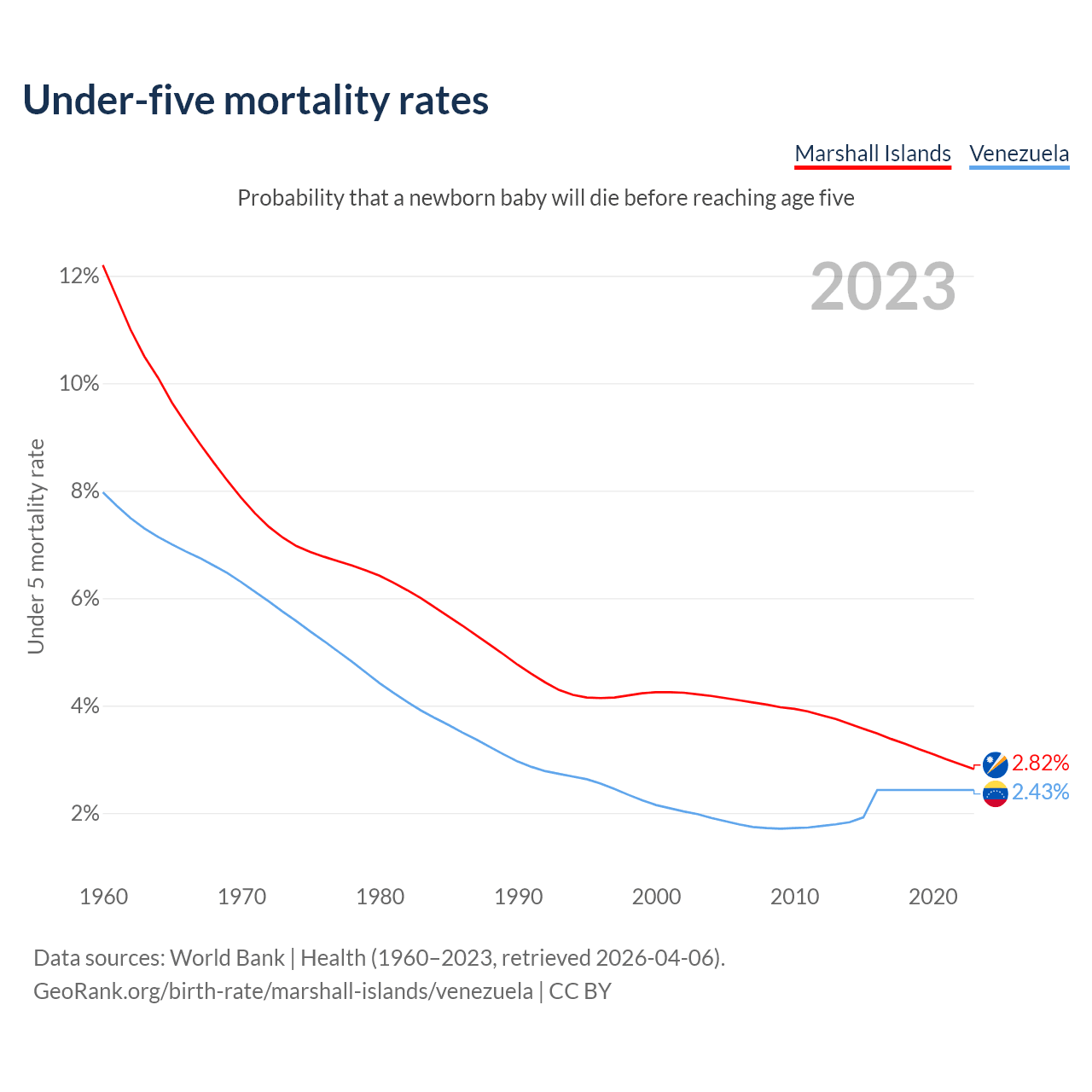 The chance that a newborn baby will die before reaching age five is 2.82% in the Marshall Islands and 2.43% in Venezuela. Above is a chart with historical data on under-five mortality rates.