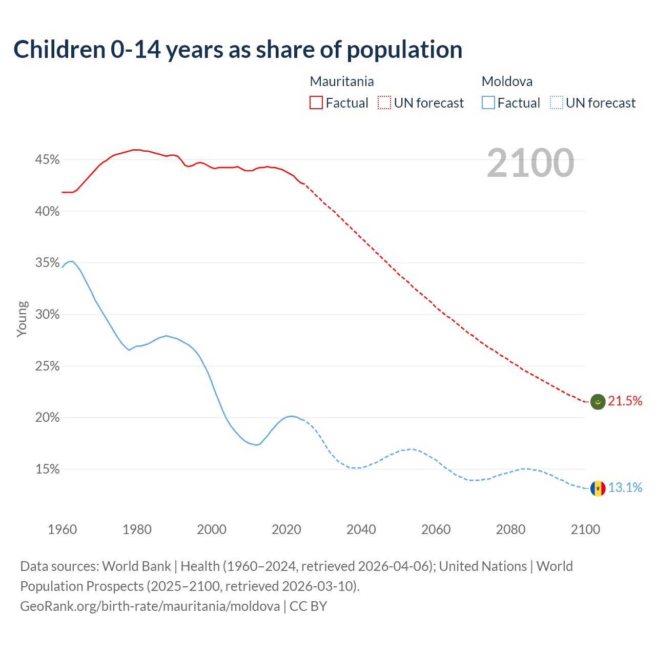 Mauritania has an annual birth rate of 34.4 births per 1,000 people, compared to 10.8 for Moldova. The average number of children a woman is expected to have during her lifetime — the fertility rate, is 4.7 in Mauritania and 1.73 in Moldova — 63.1% difference.