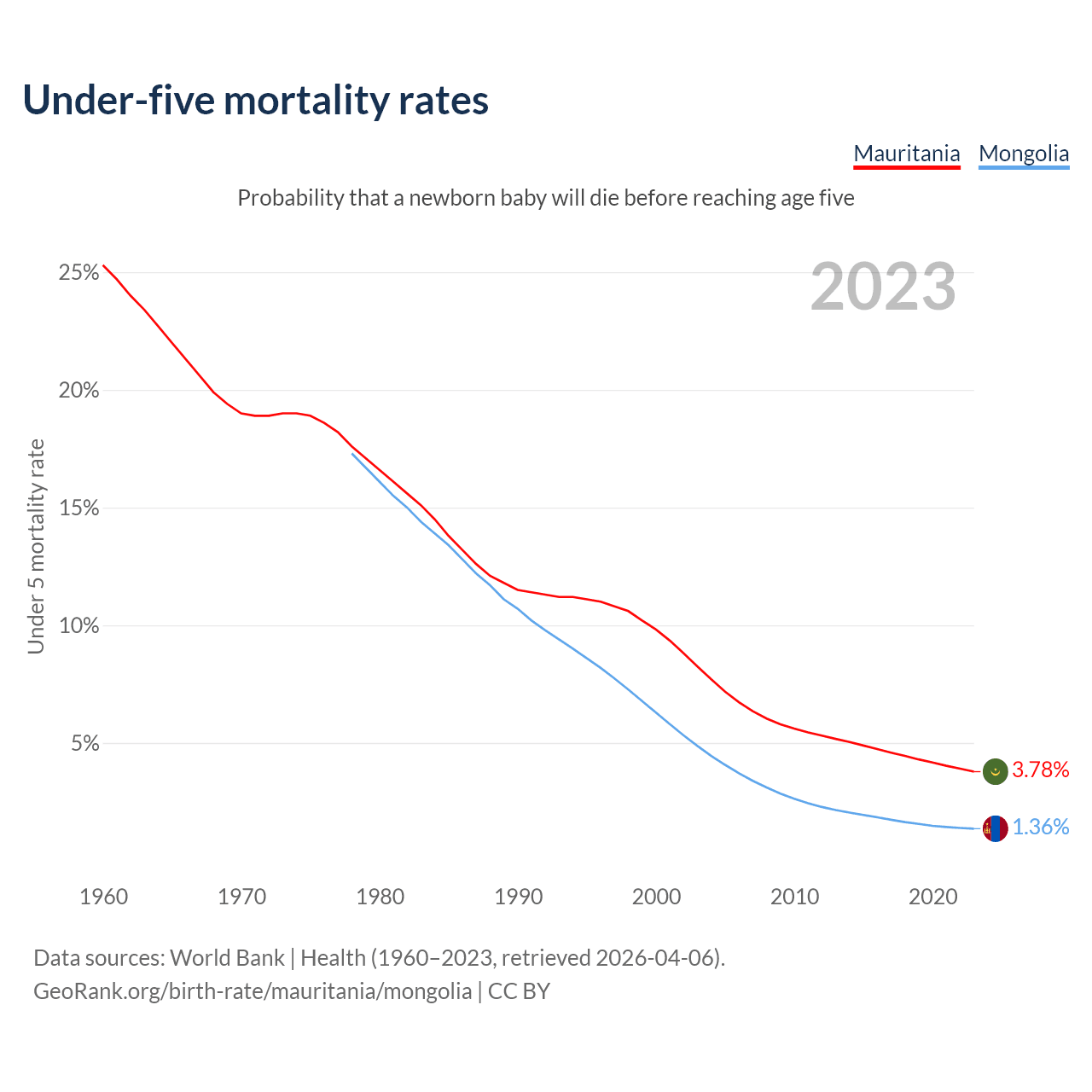 The chance that a newborn baby will die before reaching age five is 3.78% in Mauritania and 1.36% in Mongolia. Above is a chart with historical data on under-five mortality rates.