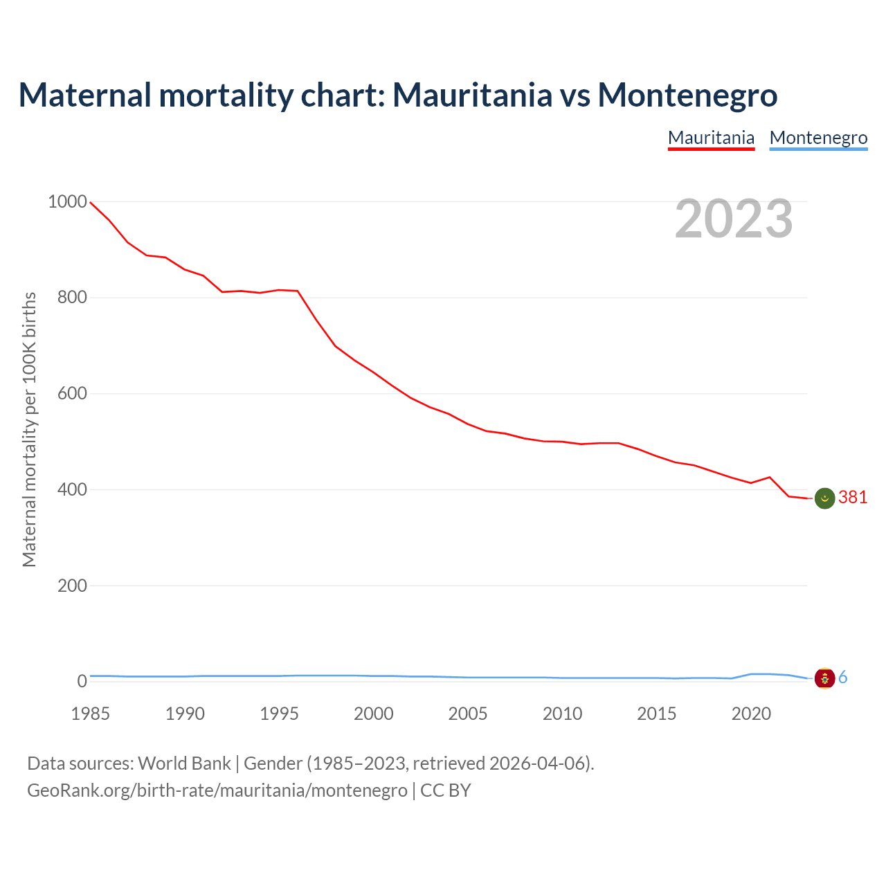 The maternal mortality rate, which is the probability of dying during childbirth or within 42 days of pregnancy termination, is 381 deaths per 100,000 live births in Mauritania, compared to 6 deaths in Montenegro.