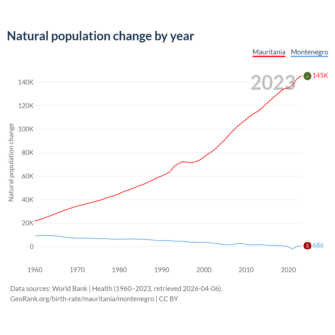 Mauritania has an annual birth rate of 34.4 births per 1,000 people, compared to 11.2 for Montenegro. The average number of children a woman is expected to have during her lifetime — the fertility rate, is 4.7 in Mauritania and 1.74 in Montenegro — 63% difference.