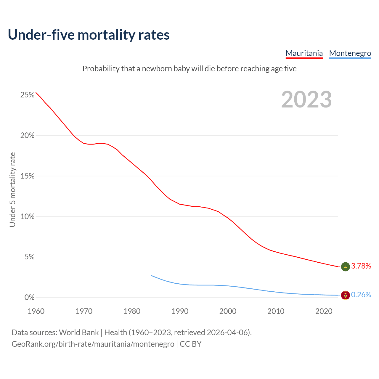 The chance that a newborn baby will die before reaching age five is 3.78% in Mauritania and 0.26% in Montenegro. Above is a chart with historical data on under-five mortality rates.