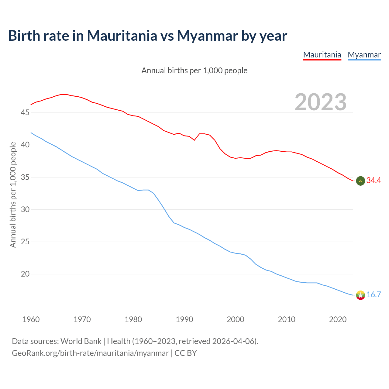 Mauritania has an annual birth rate of 34.4 births per 1,000 people, compared to 16.7 for Myanmar. The average number of children a woman is expected to have during her lifetime — the fertility rate, is 4.7 in Mauritania and 2.12 in Myanmar — 55% difference.