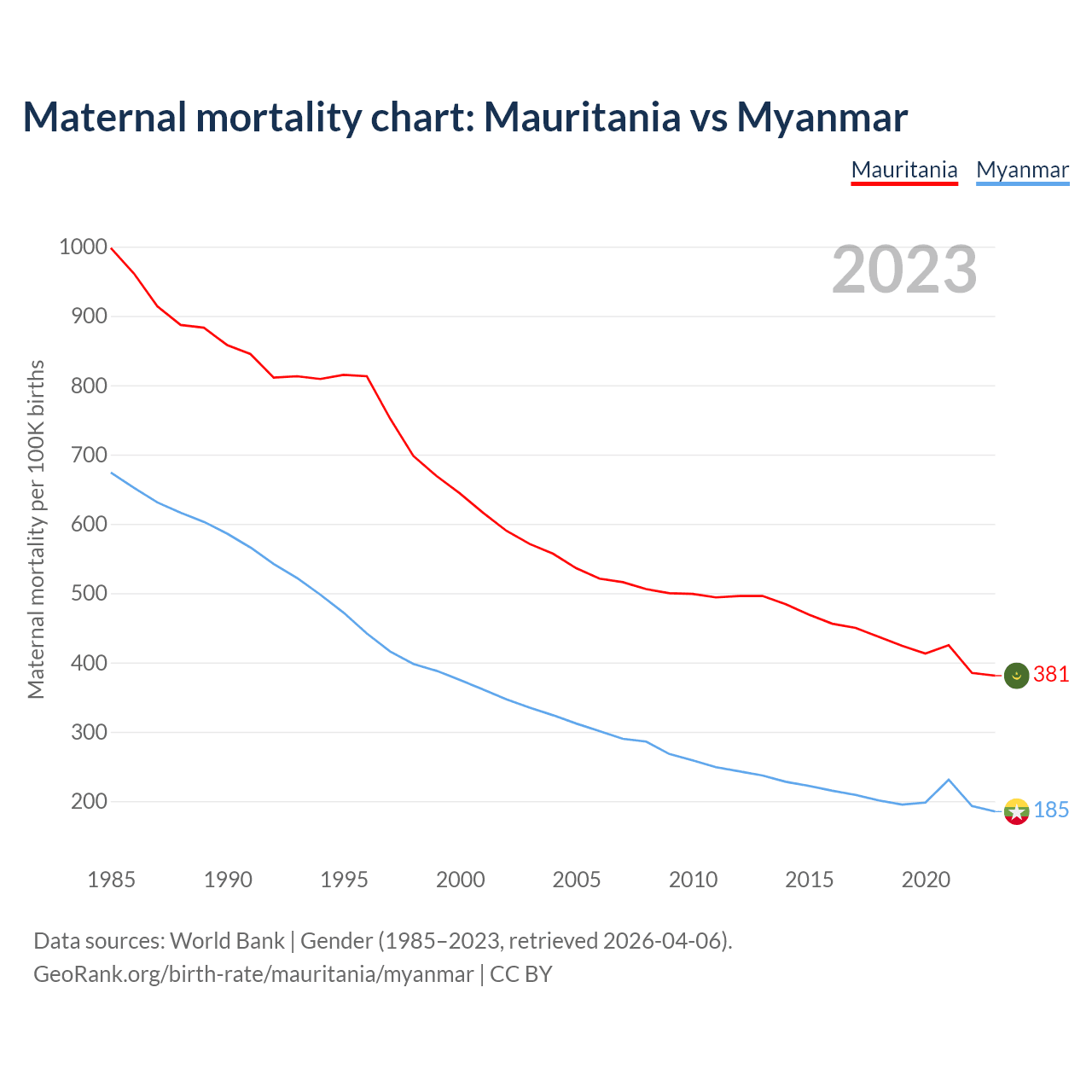 The maternal mortality rate, which is the probability of dying during childbirth or within 42 days of pregnancy termination, is 381 deaths per 100,000 live births in Mauritania, compared to 185 deaths in Myanmar.