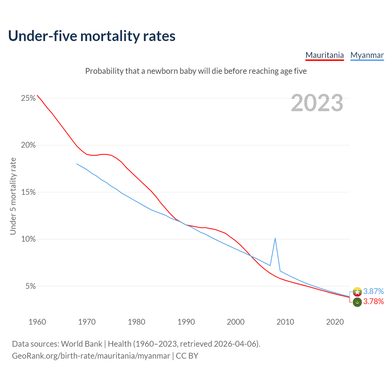 The chance that a newborn baby will die before reaching age five is 3.78% in Mauritania and 3.87% in Myanmar. Above is a chart with historical data on under-five mortality rates.