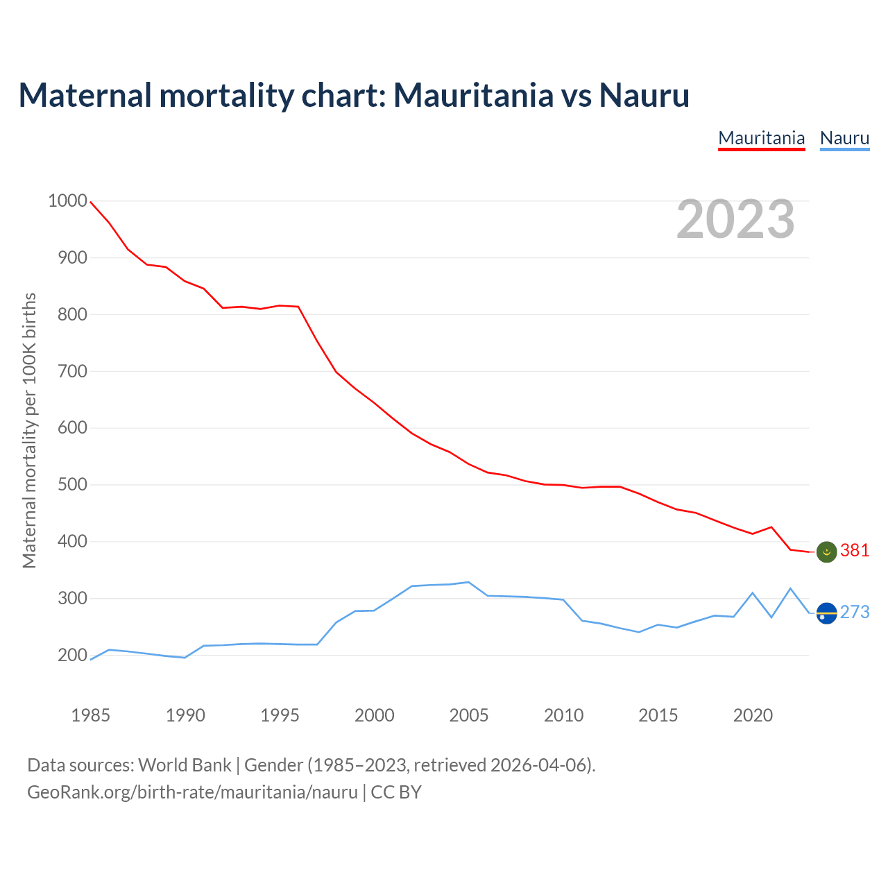The maternal mortality rate, which is the probability of dying during childbirth or within 42 days of pregnancy termination, is 381 deaths per 100,000 live births in Mauritania, compared to 273 deaths in Nauru.