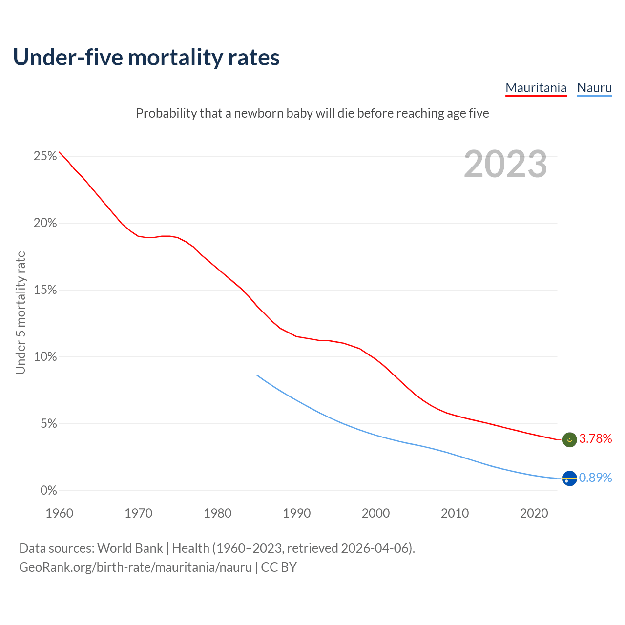 The chance that a newborn baby will die before reaching age five is 3.78% in Mauritania and 0.89% in Nauru. Above is a chart with historical data on under-five mortality rates.