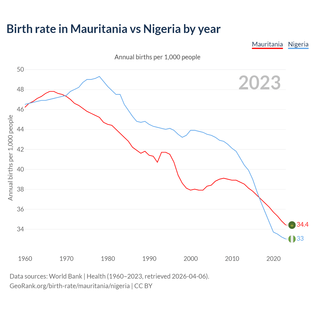 Mauritania has an annual birth rate of 34.4 births per 1,000 people, compared to 33 for Nigeria. The average number of children a woman is expected to have during her lifetime — the fertility rate, is 4.7 in Mauritania and 4.48 in Nigeria — 4.58% difference.